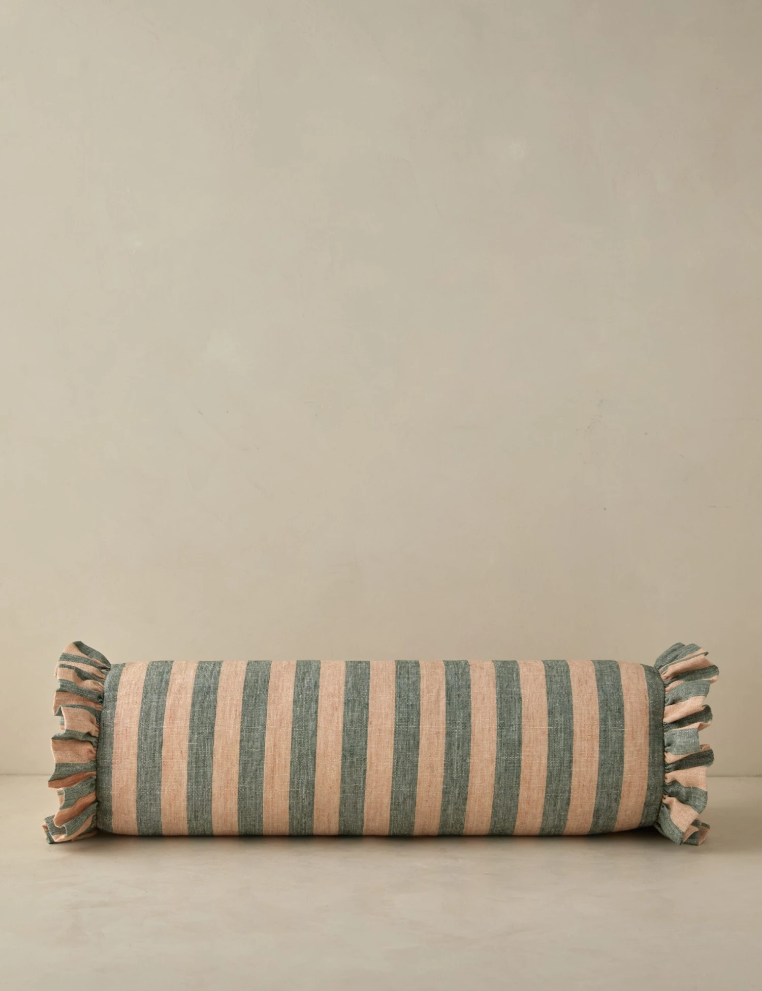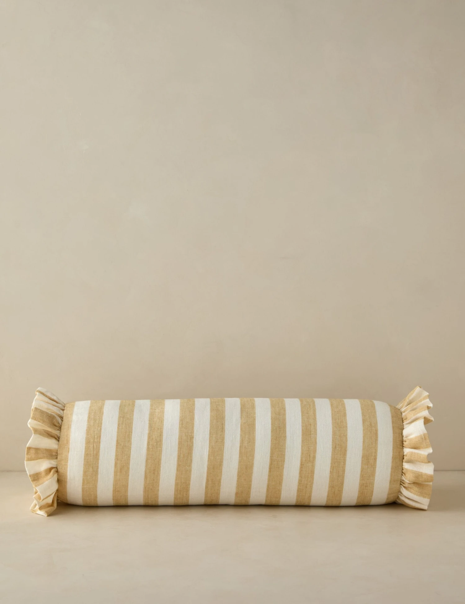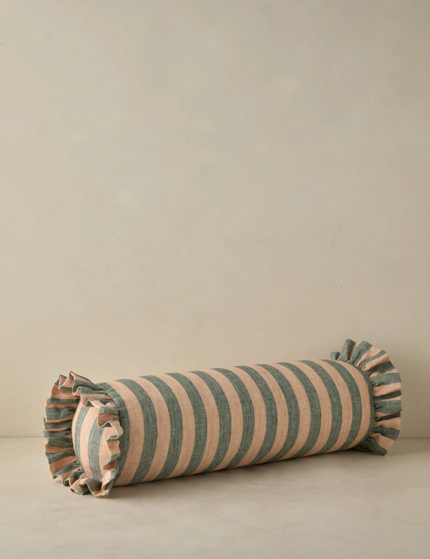 Finish your pillow edit with some vintage flair. Our Amaroso bolster pillow features a subtle striped design with ruffled ends for fresh pattern and texture in your curation. The linen offers a cool, crisp touch, perfect for everyday spaces.