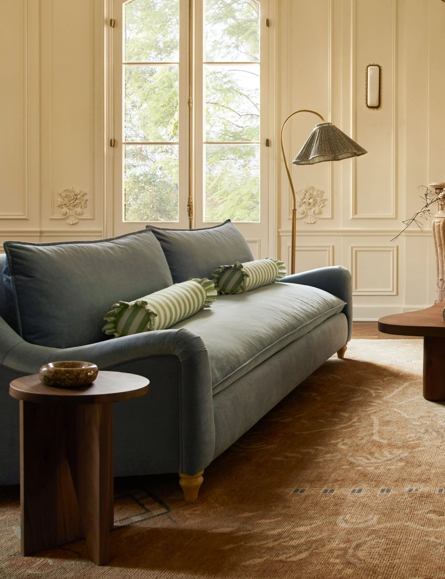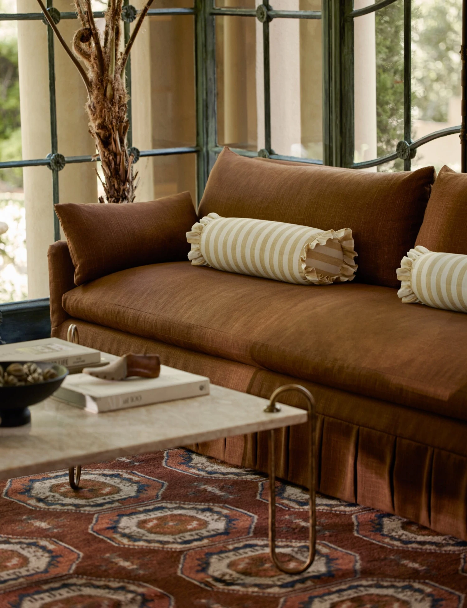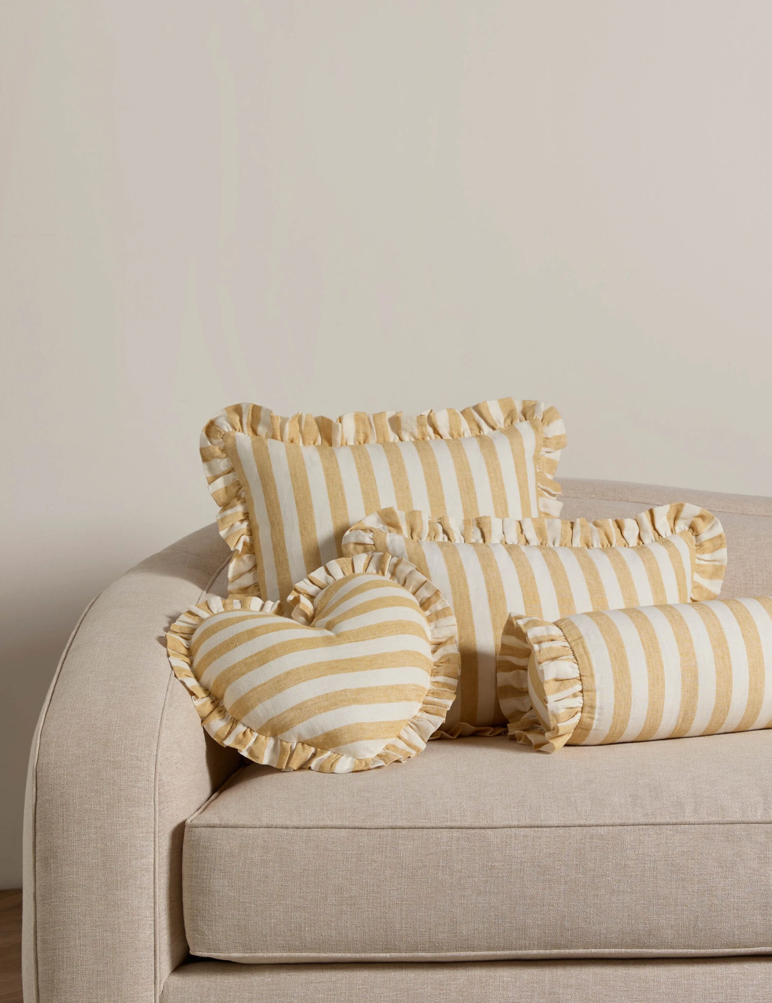 Finish your pillow edit with some vintage flair. Our Amaroso bolster pillow features a subtle striped design with ruffled ends for fresh pattern and texture in your curation. The linen offers a cool, crisp touch, perfect for everyday spaces.