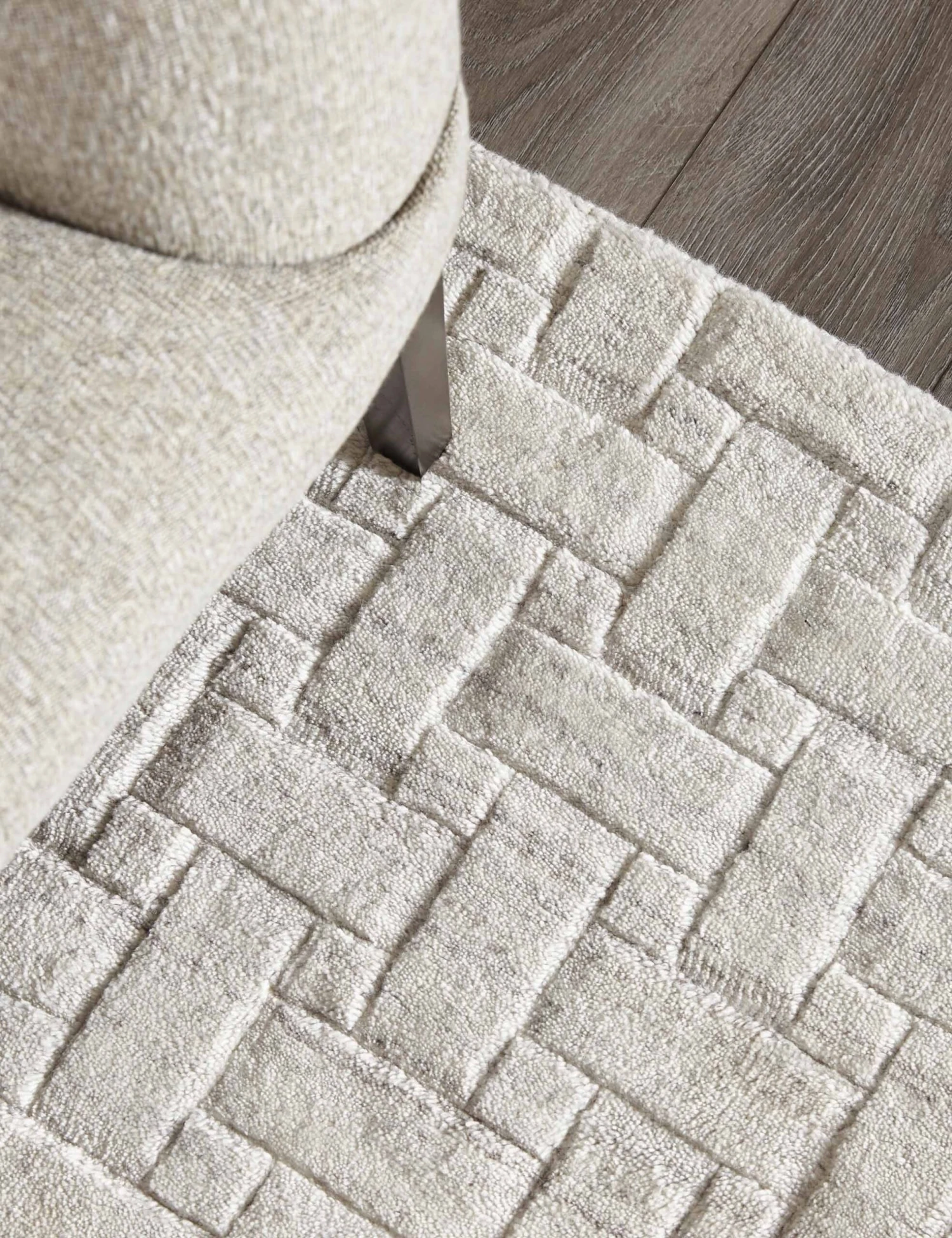 A heathered light gray color, plenty of sheen, and a warp-and-weft-inspired pattern gives this tonal floor rug a modern, luxe look. Hand-loomed and made from a viscose-wool blend, this beautiful area rug sits well with other inviting neutrals or darker wood finishes in your bedroom or living room.