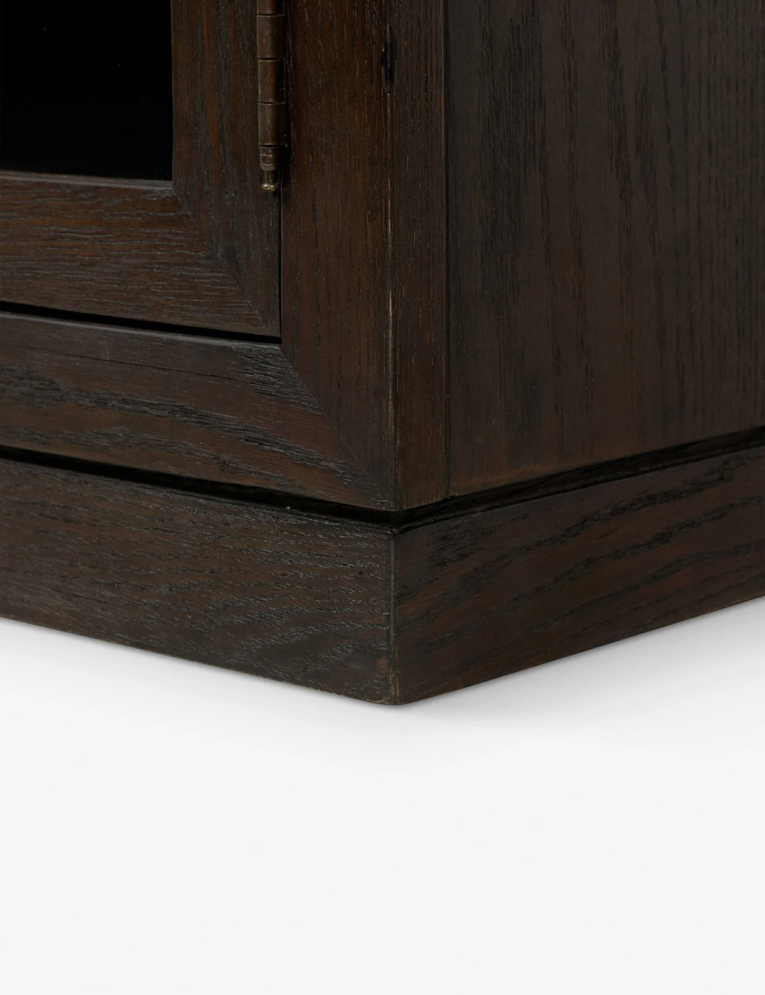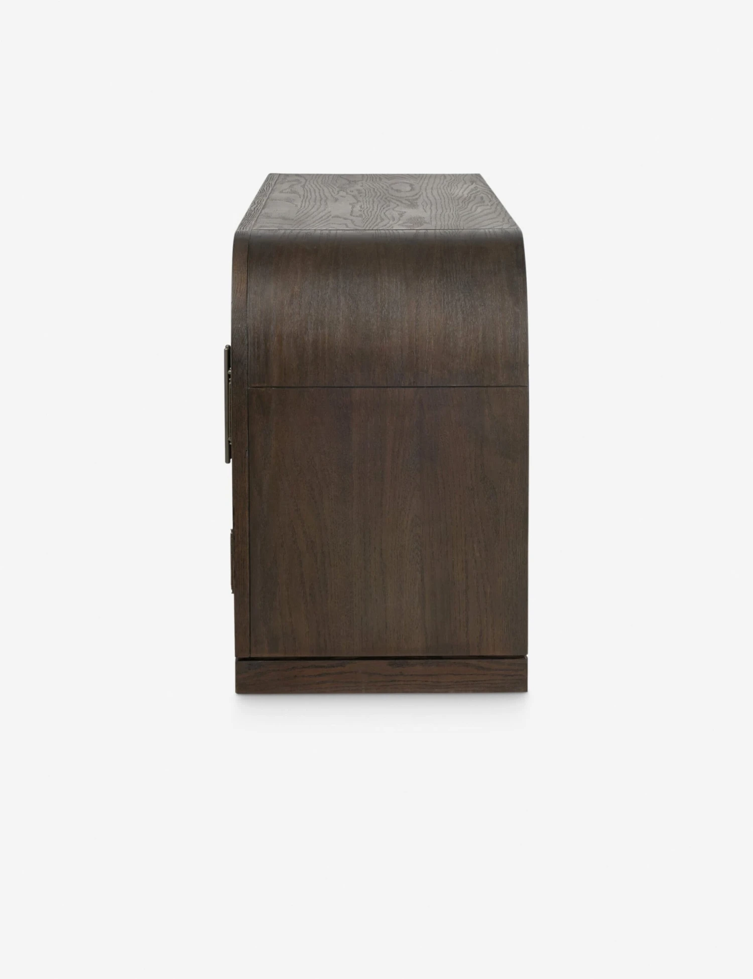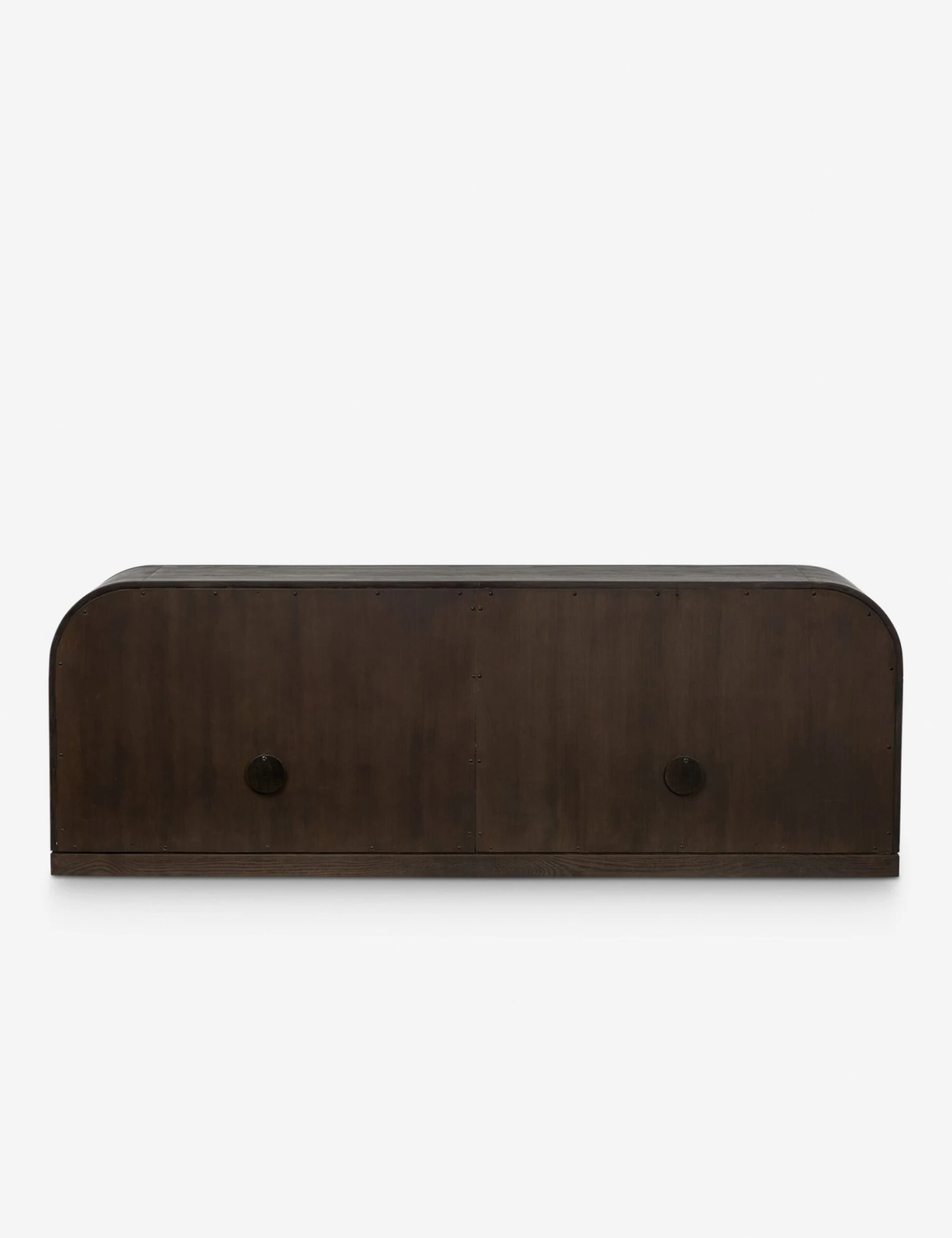 The Capitola media console balances spacious storage with a curated edge. The arched lines and flush plinth base bring a sleek elegance to the understated design, while glass panel doors and a dark finish create a dramatic display for decor and electronics.