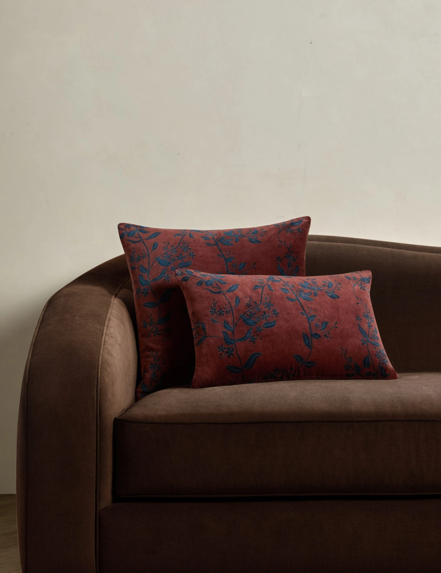 A velvet throw pillow is the ultimate touch of luxury. Carmine features a dark floral print against rich red velvet—the perfect accent pillow to add depth to your curation.