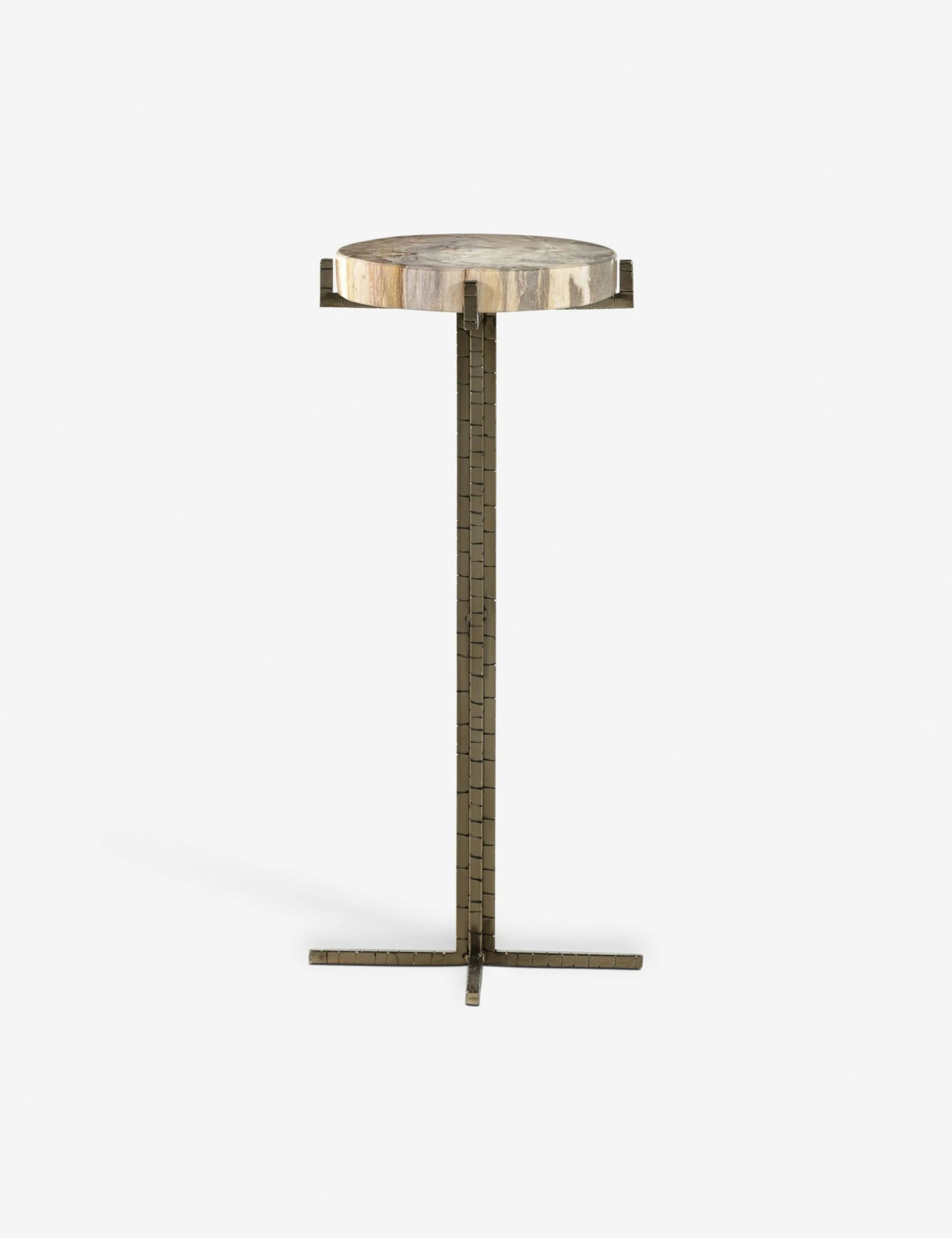 A beautiful slice of petrified wood brings a rich, organic feel to this modern side table. Its cocktail-style silhouette is tall with a round top, while its brass base adds textural character. Add this end table to a pair of armchairs for a refined presentation.
