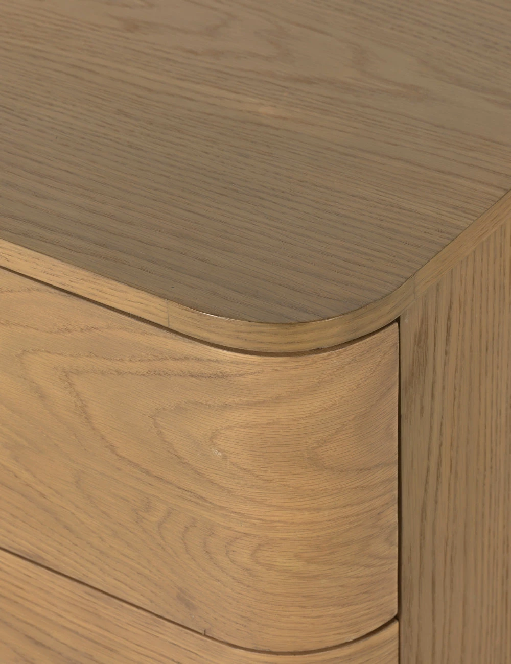 Bring a dramatic edge to your bedroom set with the Cyrus Collection. Clad in an oak veneer burnished to highlight its beautiful natural grain, this dresser sits on chunky cylinder legs setting off a unique silhouette. Six spacious drawers with iron pulls offer ample storage while the single curved side creates a perfect touch of contrast.