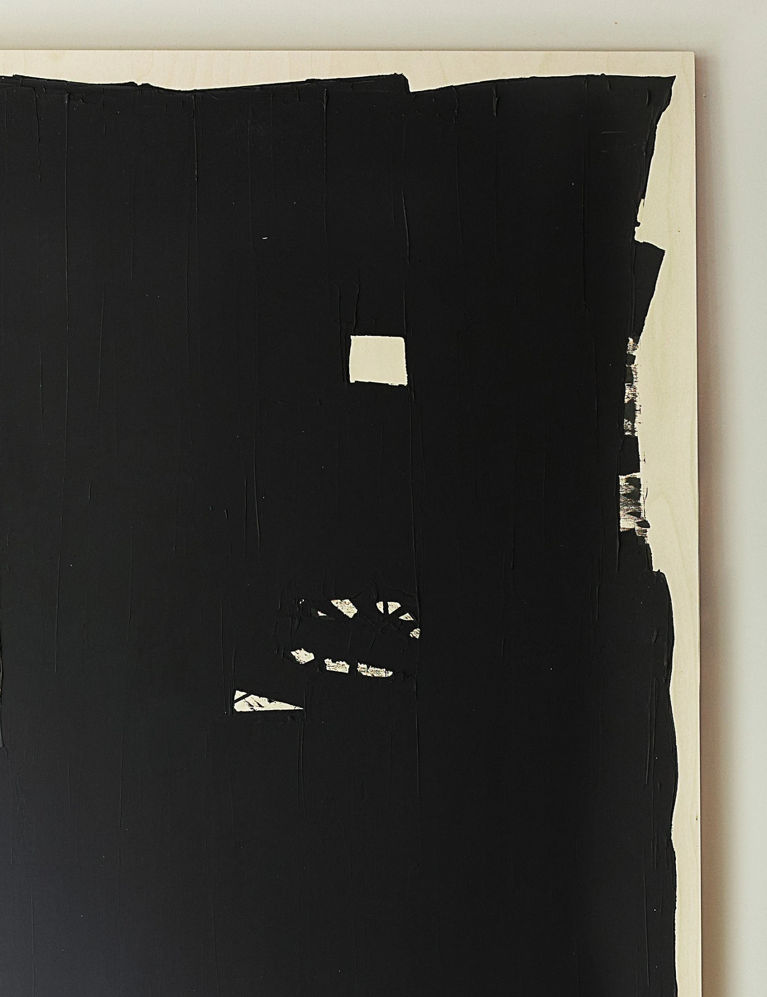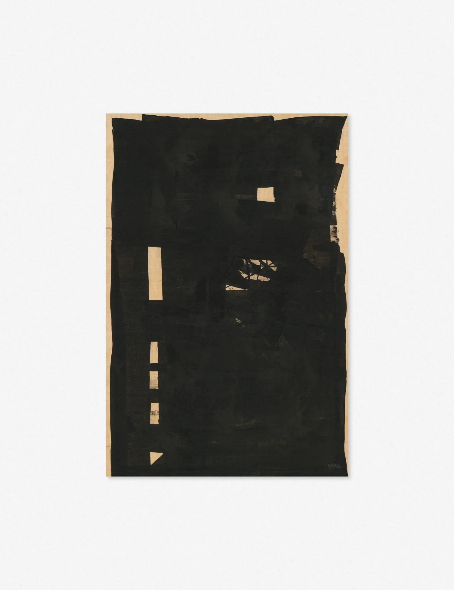 A minimalist composition offers visual impact in this abstract wall artwork by contrasting a dominant black form against the natural wood grain backdrop. Each piece in the Davao series is created by applying giclée printing to a birchwood plank and then embellished by hand to offer a striking, modern element for a gallery art wall or standalone feature piece.