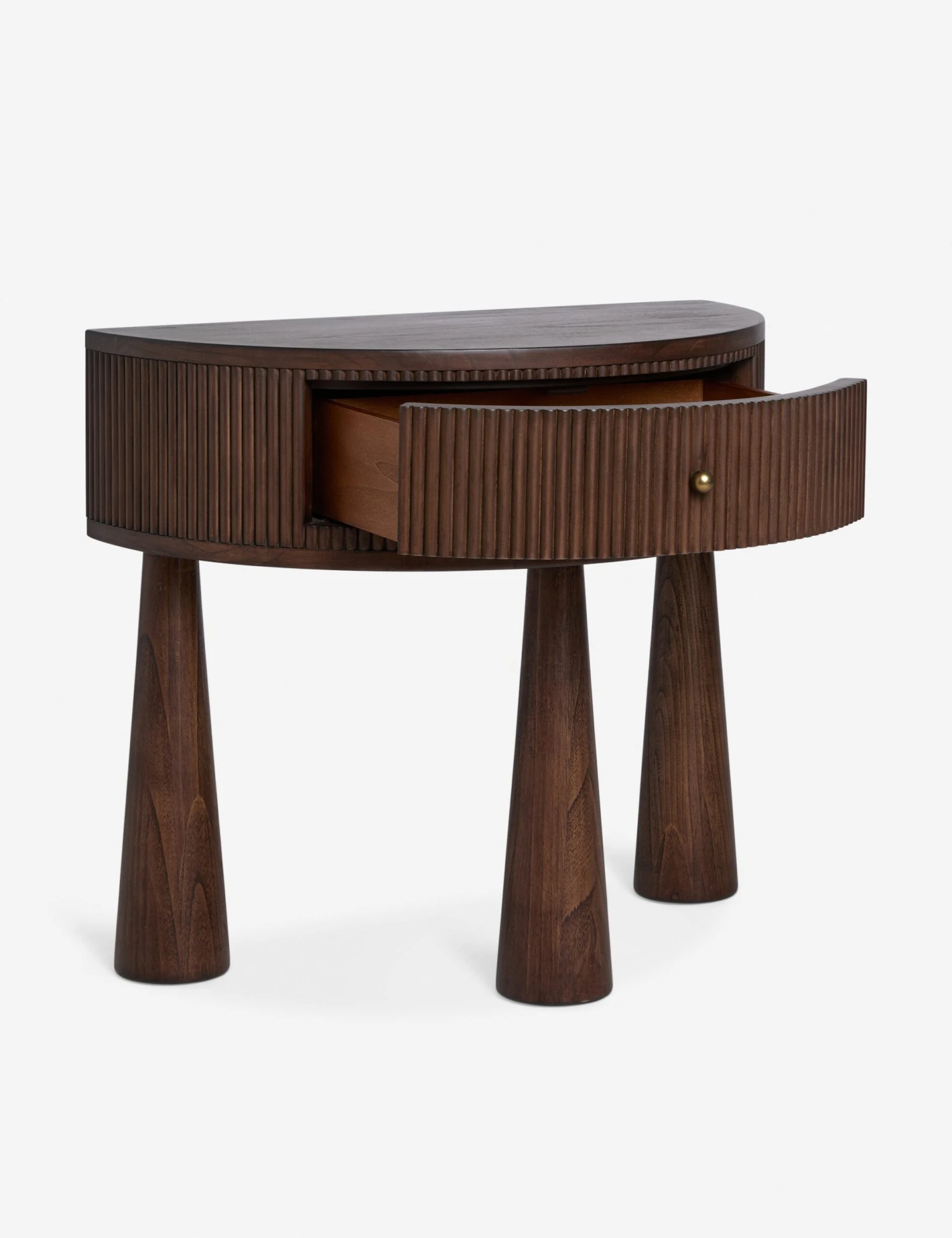 Natural grain texture takes a sculptural turn in our Fletcher nightstand. The modern silhouette is defined by its chunky tapered legs and a crescent-shaped top with fluting along the sides. This wood nightstand strikes an artful poise at your bedside—with a single drawer for the perfect touch of storage.