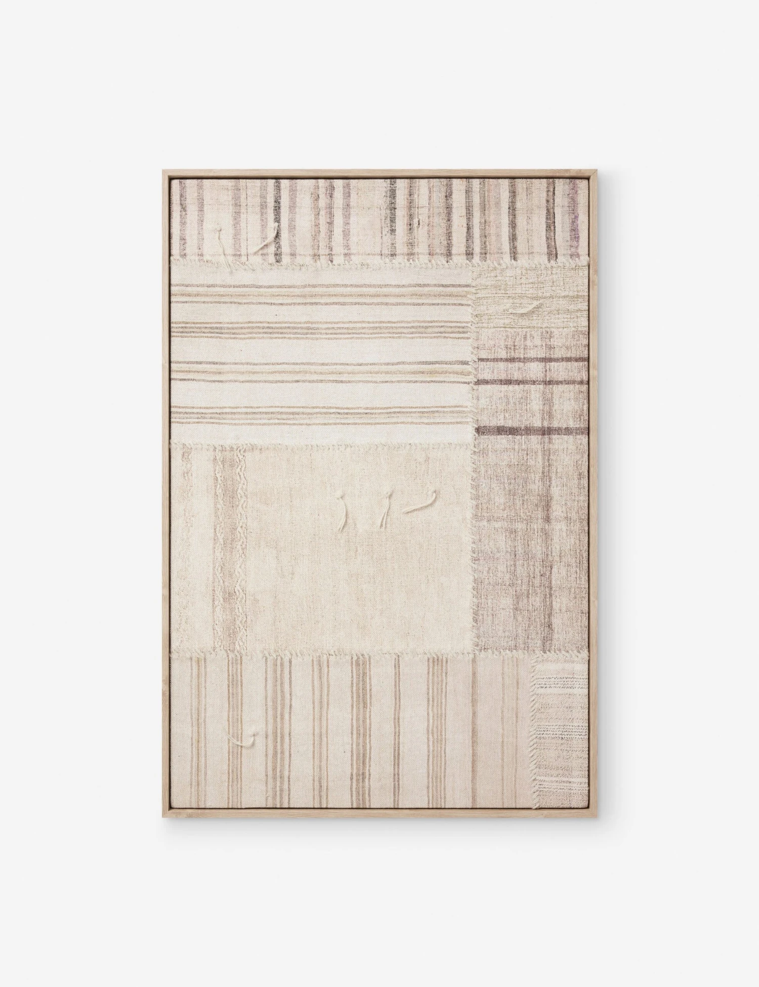 Textile wall art can transcend the frame, becoming a showcase of the process and materials that go into its construction. This patchwork assemblage is stitched together to create a pattern block design that finds unity through minimalist tones and a textural weave. The visible seams and pulled thread accents add to the sense of artistry and make for a rich addition to modern wall decor. This piece makes a versatile addition to minimalist curations and gallery walls.