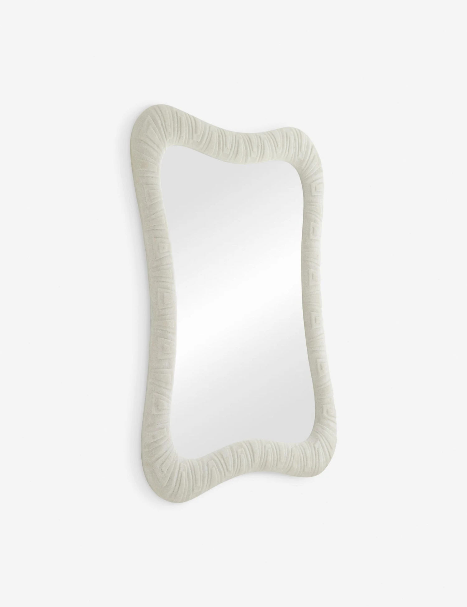 A concave form gives the Fuller mirror its sculptural edge. Rhythmic grooves on the white frame catch light and shadow, bringing a subtle texture to the modern form. Generously scaled, this large wall mirror makes a soft, geometric statement above a console, dresser, or mantel.