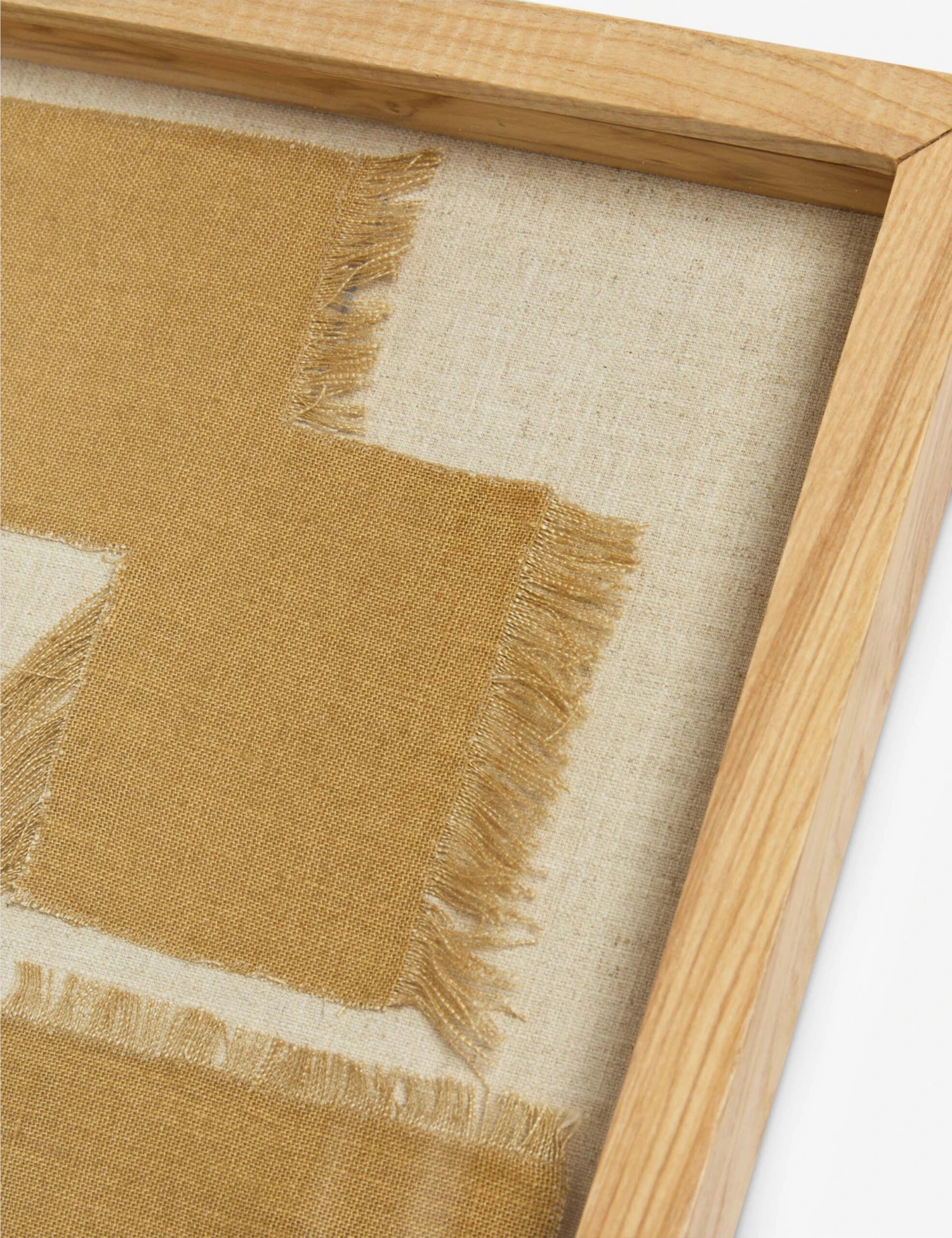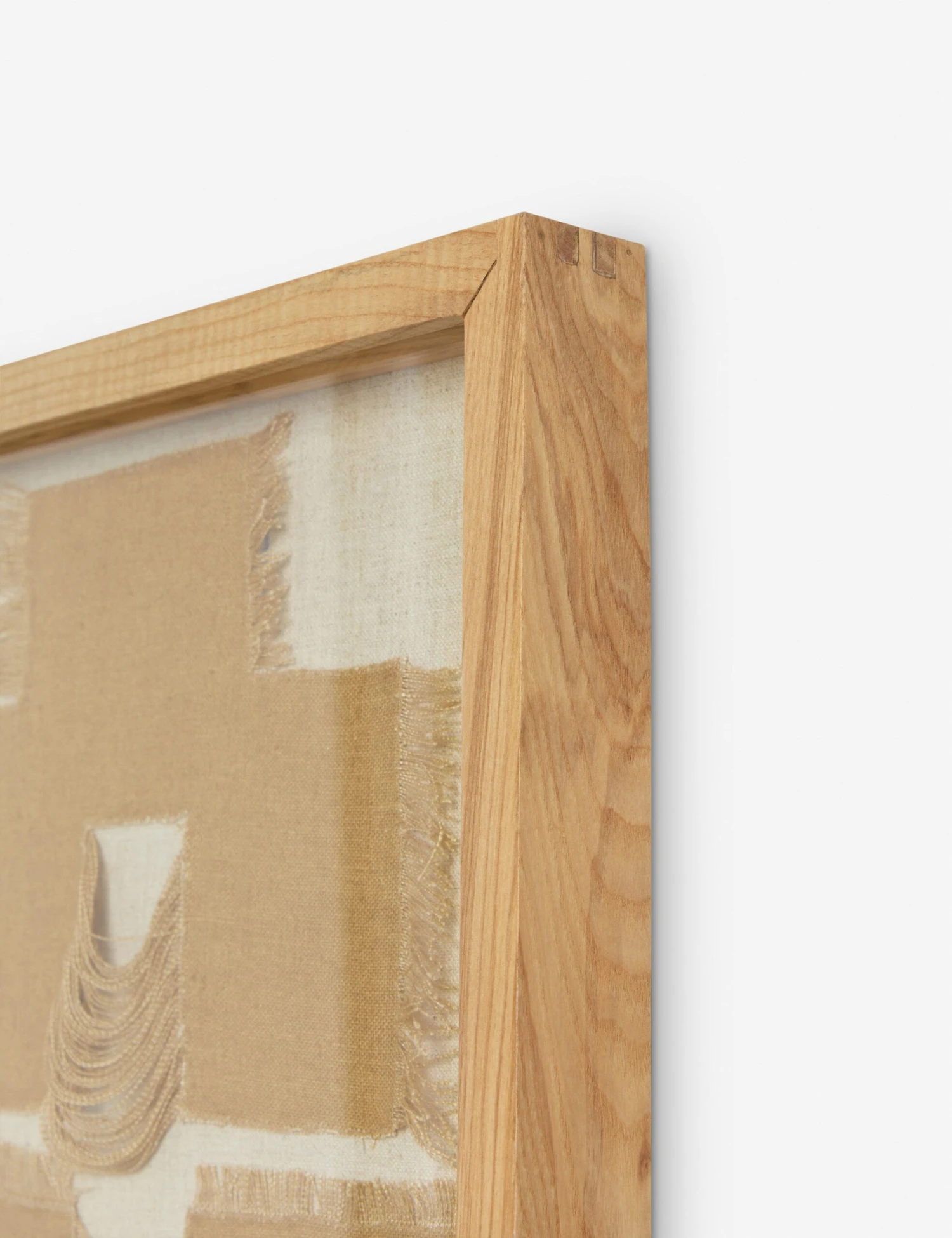 This textile wall art takes a geometric approach, layering cut fiber forms in a symmetrical arrangement. The design balances softness and structure with subtle fringe detailing that adds textural interest. Set in an ash wood frame, it’s a refined addition to your wall decor—grounded, timeless, and quietly bold.