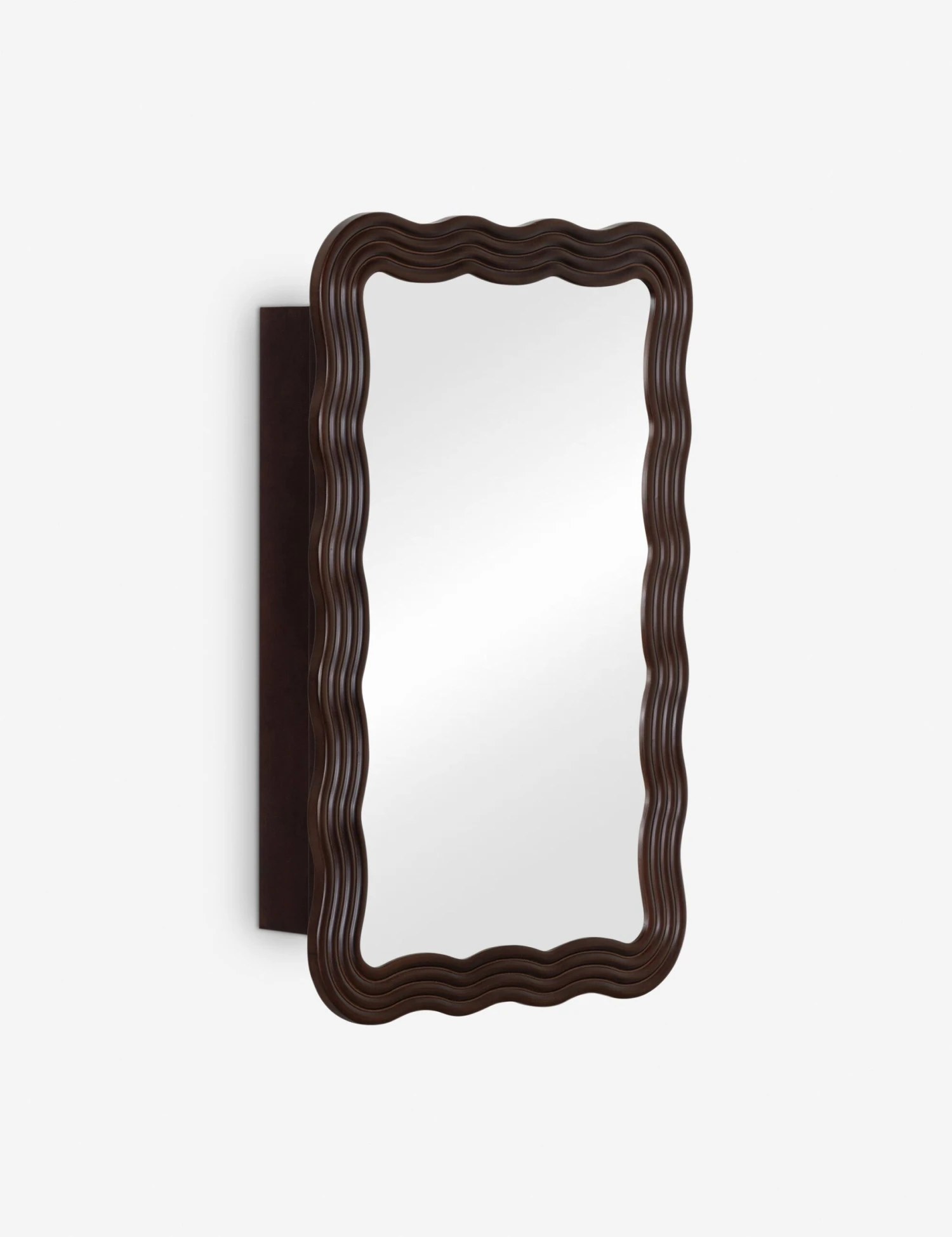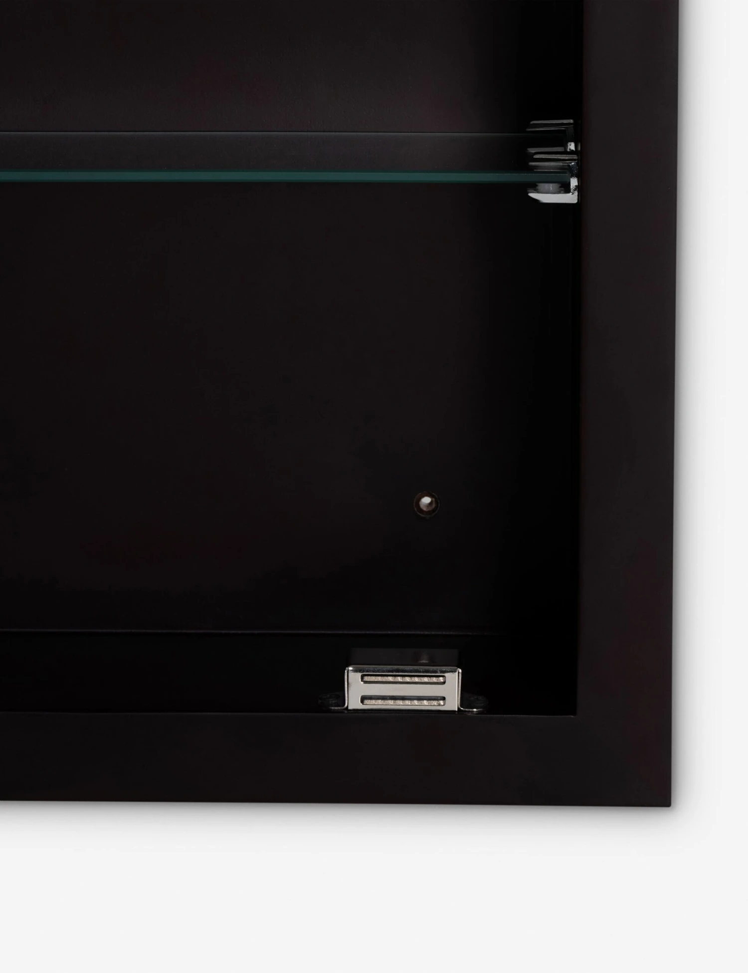 With a curving frame and deep mahogany finish, the Haston medicine cabinet brings a sculptural touch to bathroom storage. Its reversible door opens to reveal hidden storage—blending everyday function with standout form.