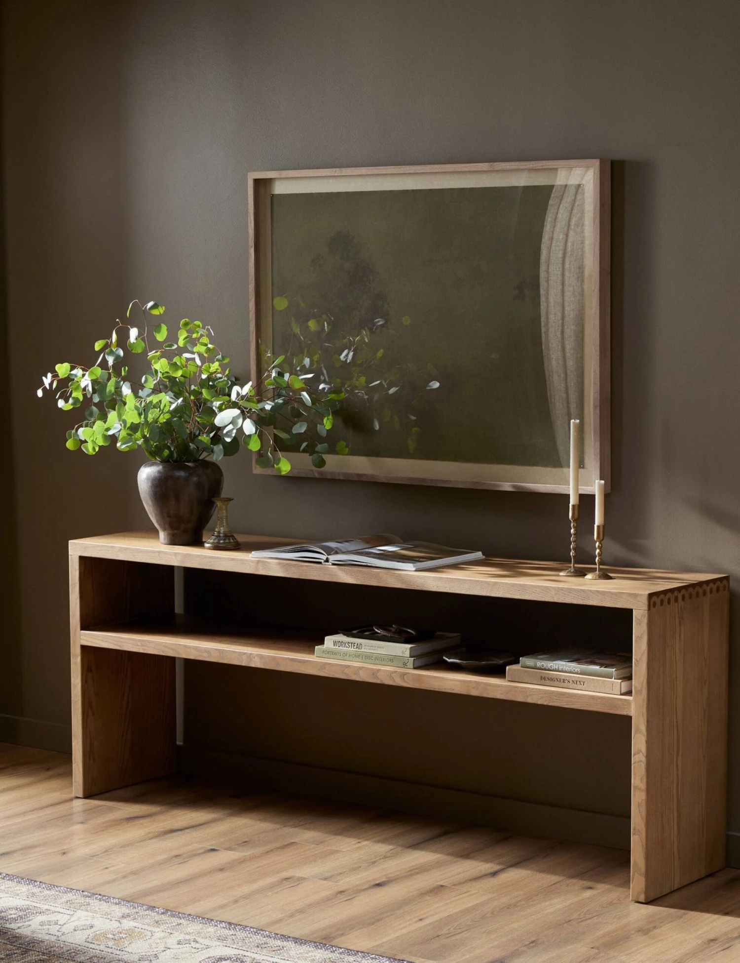 Four Hands brings their exceptional craftsmanship to a timeless collection rooted in Amber Lewis’ perennial California style. Scalloped detailing brings depth and flair to the clean lines of this modern console table. The waterfall design feels casual yet refined, with a lower shelf for added storage—an elegant addition whether styled as a living room accent or an entryway table.