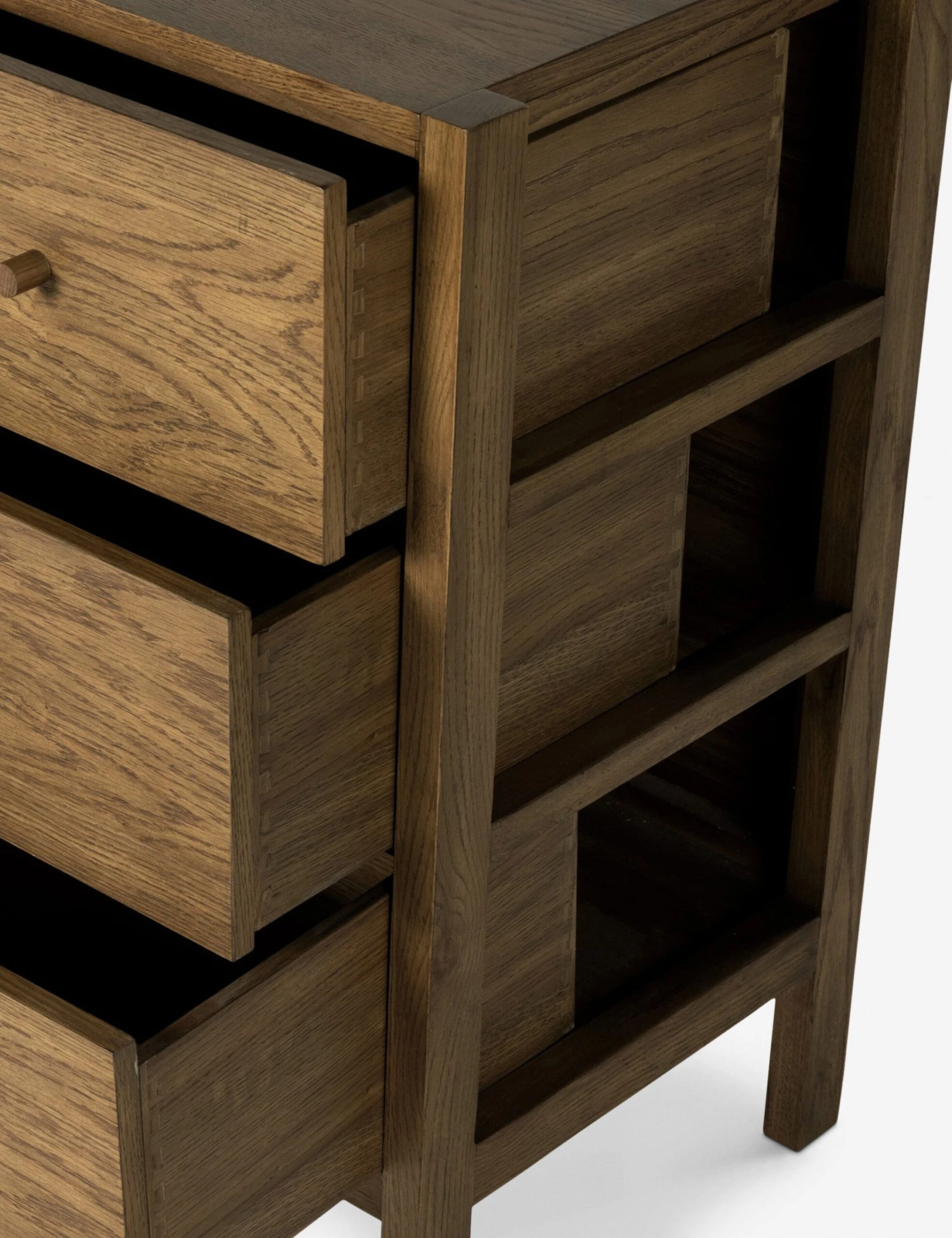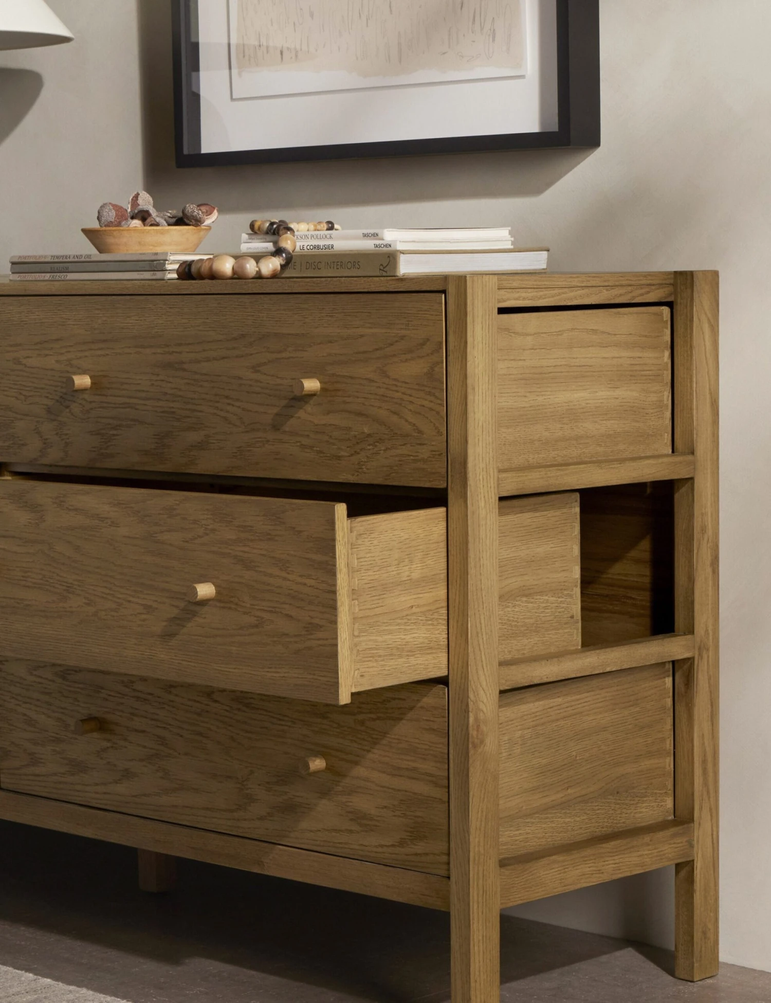 With its exposed framework and minimalist lines, this dresser offers a fresh take on mid-century styling. The streamlined casing and understated hardware keep the look crisp and versatile—an easy anchor for modern bedroom spaces.