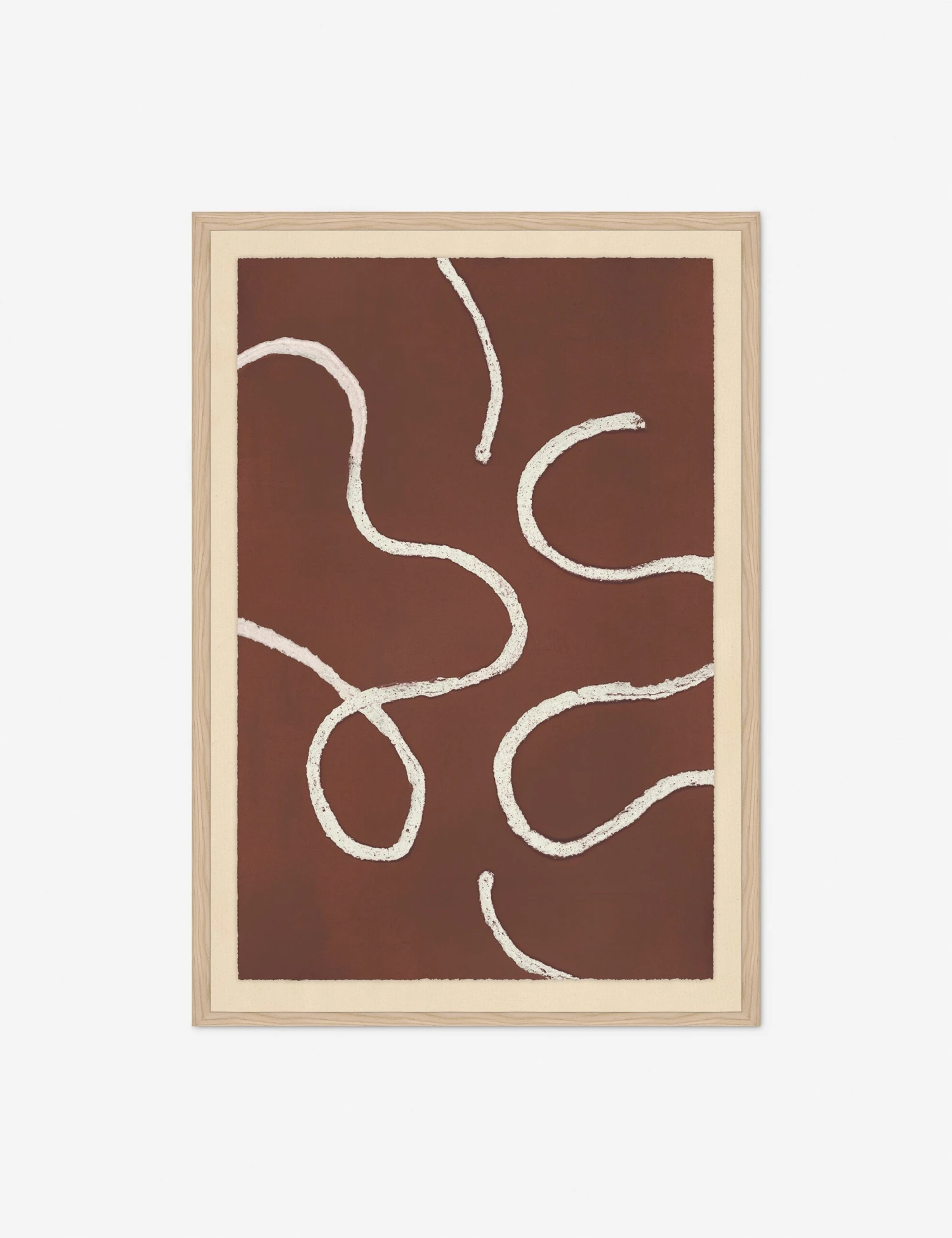 The Infinitely Bound wall art series features winding lines across a deep terracotta field, offering bold impact against the mat border. This framed wall artwork brings a modern sensibility to any curation.