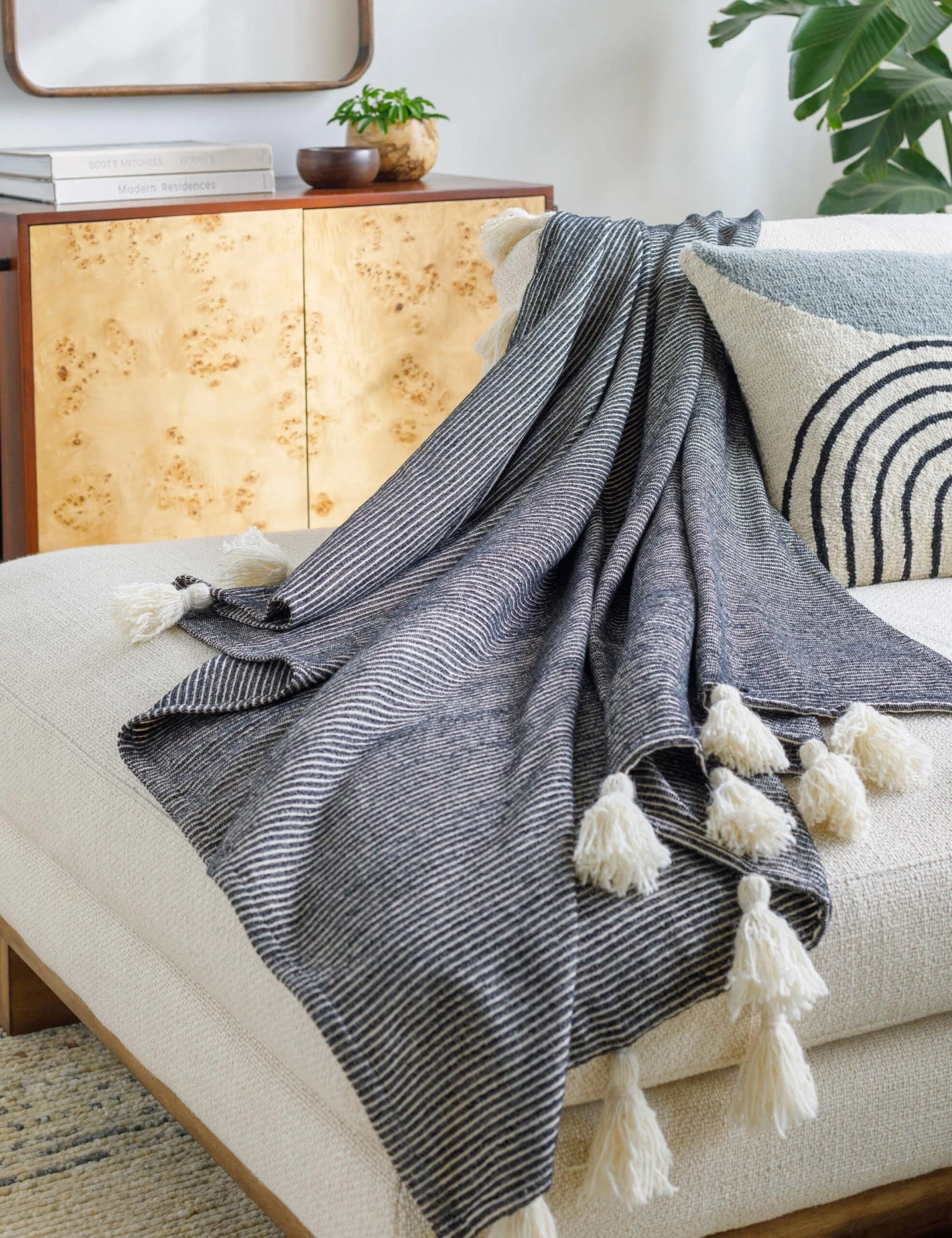 Becki Owens brings her hallmark blend of warmth and elegance to a collection of soft touches with Surya. Comfort comes chic in the Kapri throw, featuring a striped design and generous tassel fringe. The thoughtful mix of modern and timeless style notes makes it the perfect addition to a transitional living space.