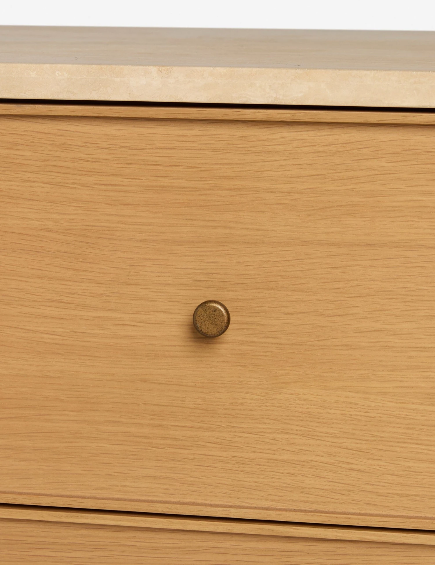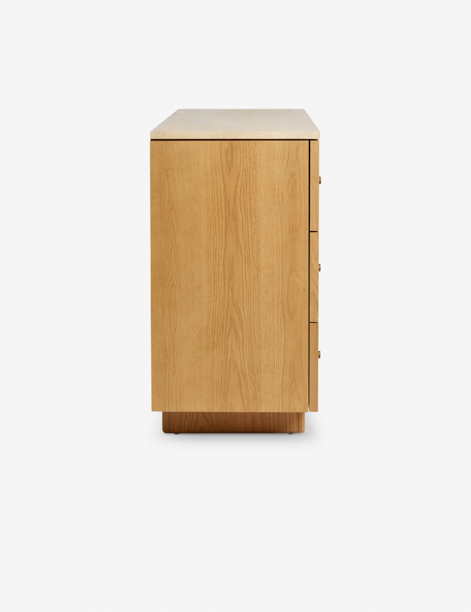 A mix of rich materials and thoughtful design define our Keshan dresser. The oak case is topped with natural travertine for a grounded yet refined finish, while fluted legs lift the profile with sculptural poise. With six drawers, it offers plenty of storage wrapped in a clean, stylish form.