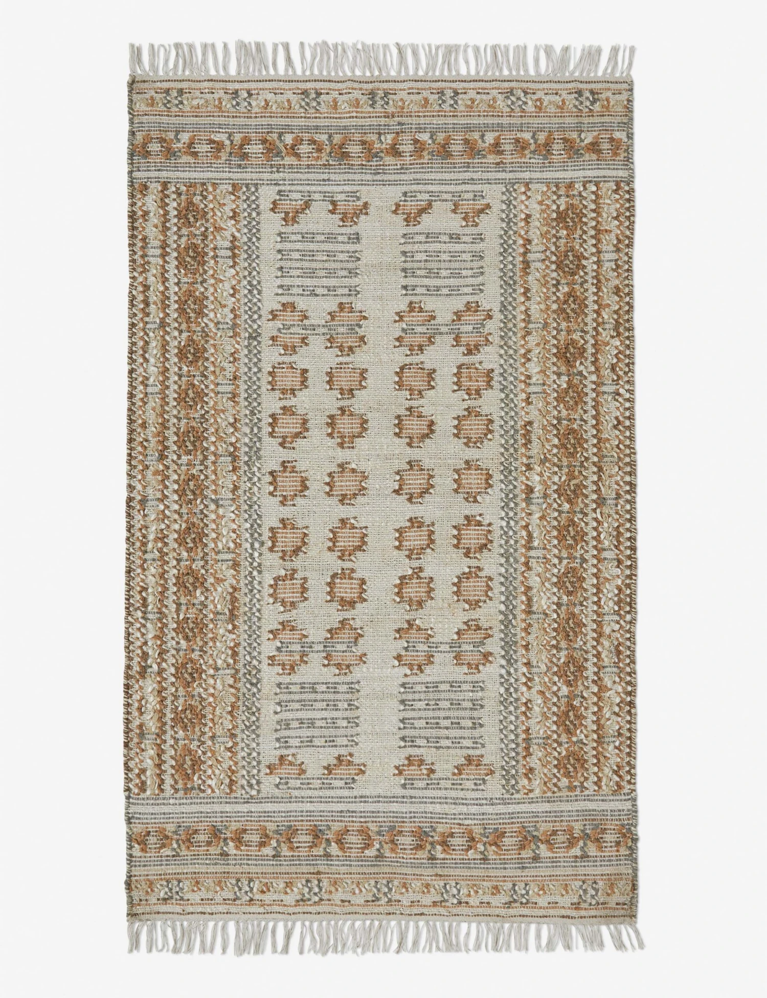Revel in the artisanry and traditional motif of the Keziah rug. A dynamic blend of jute and wool with a touch of cotton brings natural texture appeal to this timeless floor rug design. The low pile and durable materiality of this jute flatweave are ideal for a heavily traveled hallway or casual lounge.