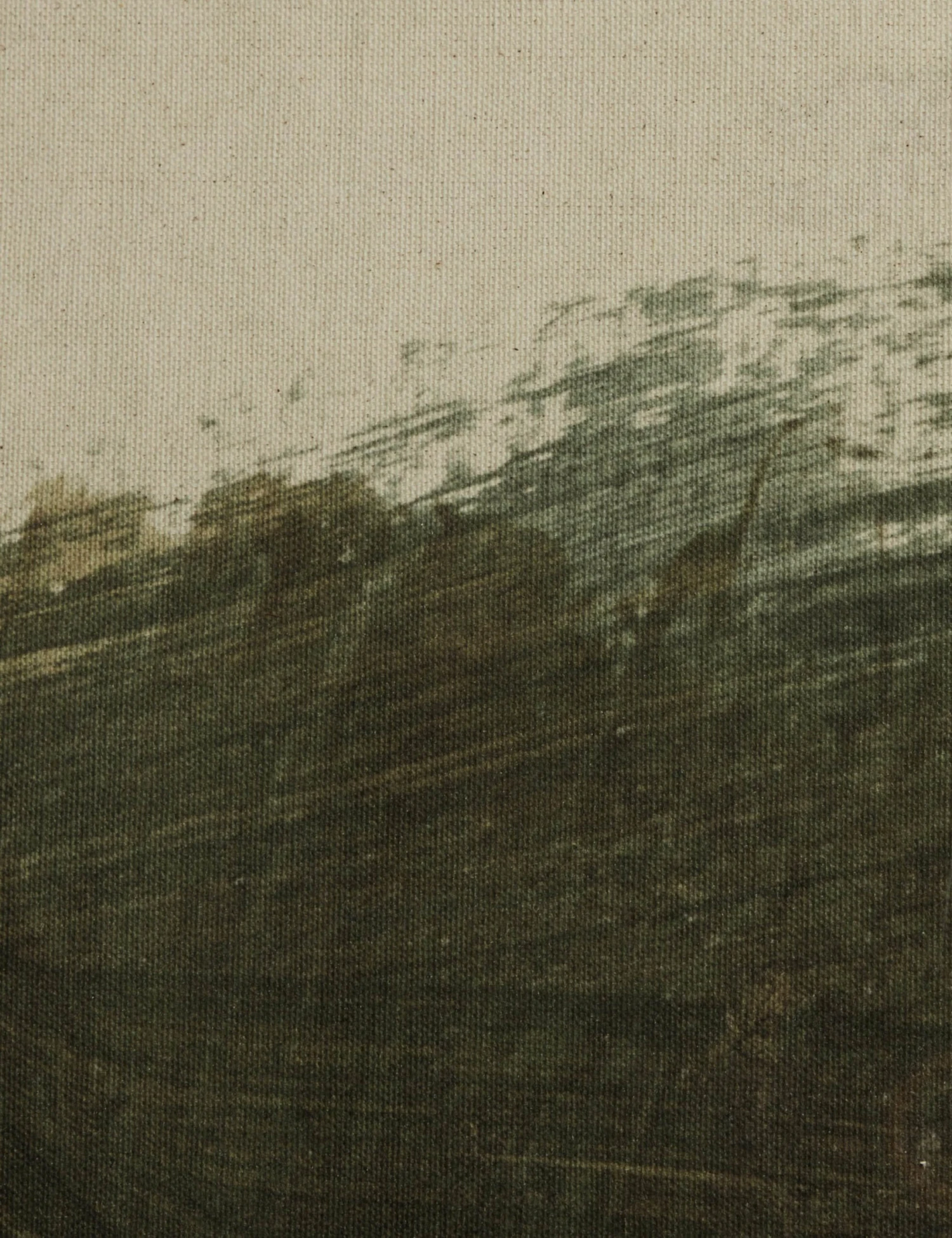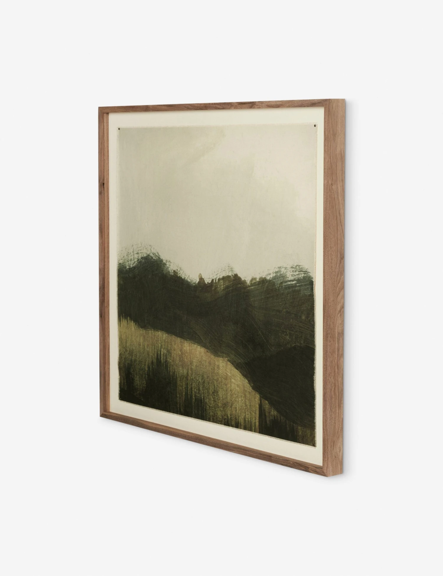 This abstract landscape features a moody composition with sweeping brushstrokes and tonal contrast. Its earthy palette of olive, moss, and taupe evokes a grounded, calming feel. The artwork is printed on raw canvas and framed in rustic walnut for a refined presentation in your wall decor.