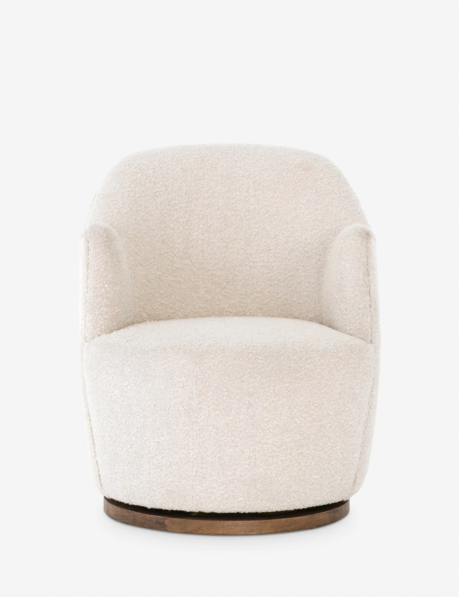 Nubby fabric on the Margie Swivel chair creates an invitation to cozy up and sit. A circular shape makes for a unique piece, and a wooden swivel base allows for conversation in any part of the room.