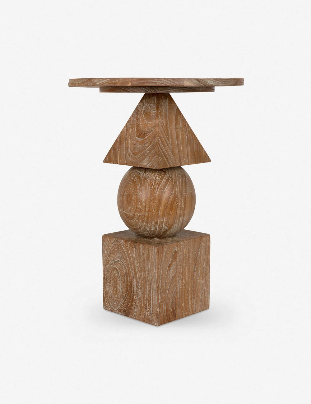 Stacked shapes carved from mindi wood ground this sculptural side table with a natural balance. A light wash finish highlights the beautiful natural grain, offering an ideal pedestal for organic decor or an eye-catching end table with a stylish edge.