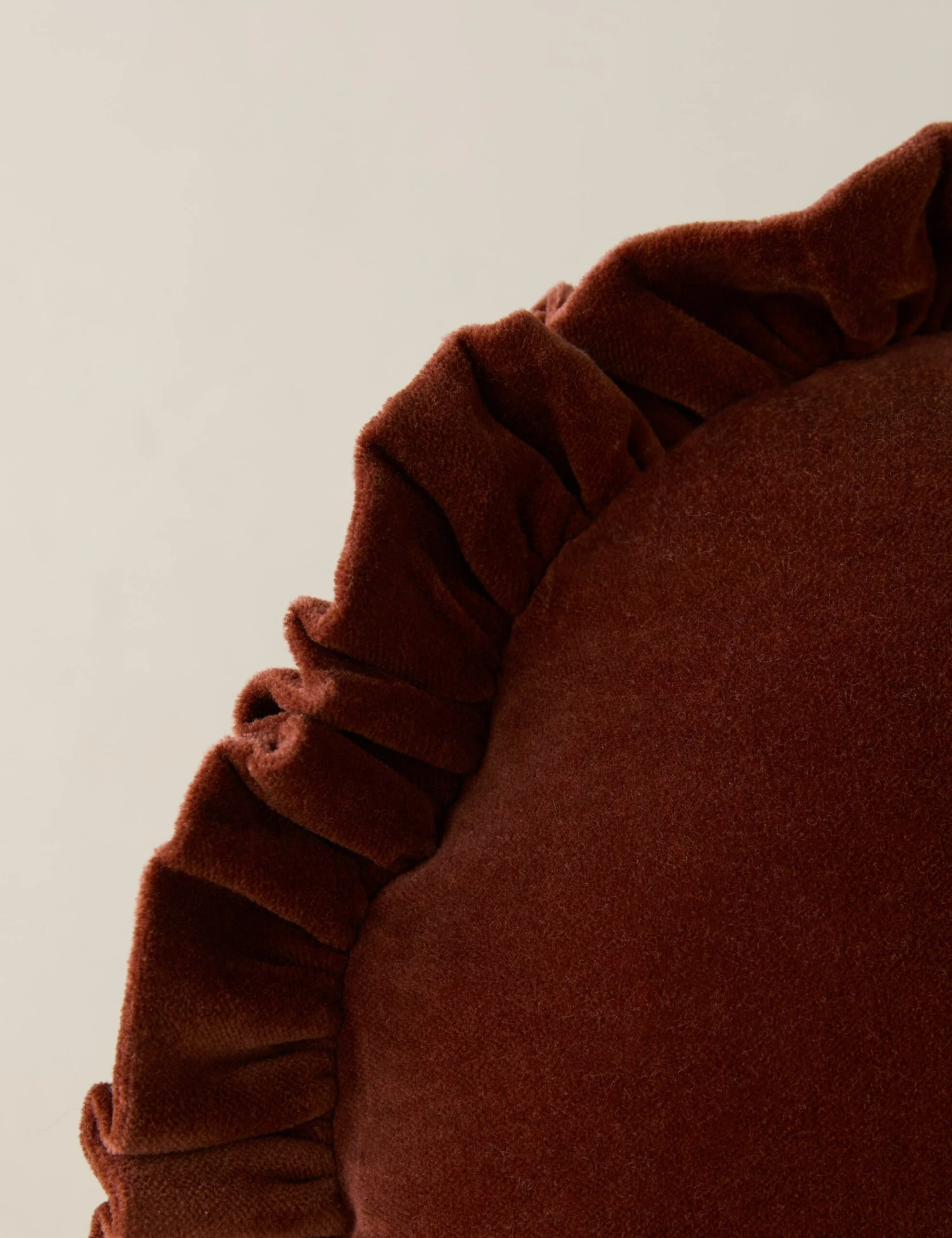 Velvet with a ruffled flange? That’s luxury in touch. A solid design balances our Mauree pillow for a glamorous yet refined accent. This round throw pillow is a rich addition to thoughtfully layered spaces.