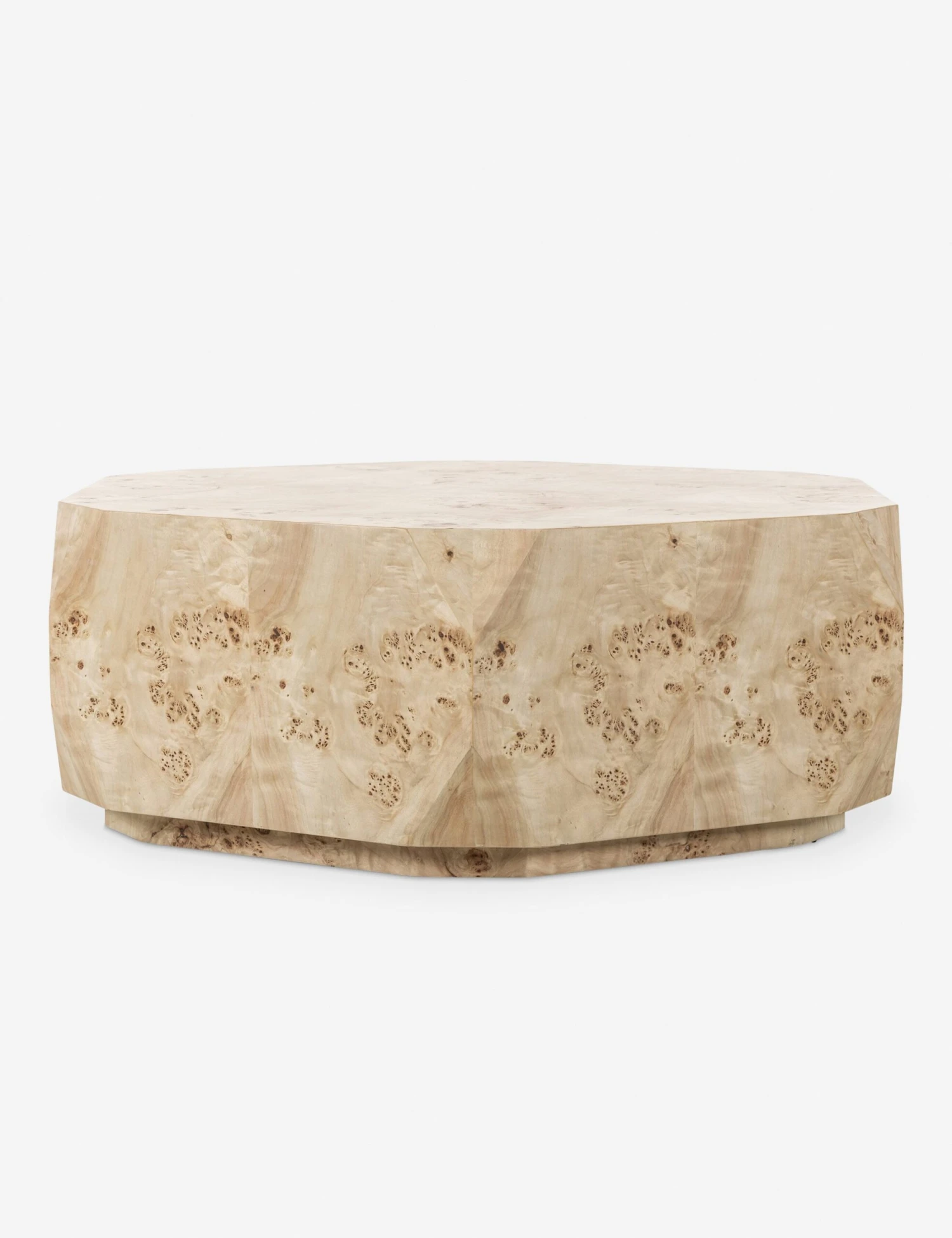 This burl wood coffee table makes a sculptural statement with its bold shape and rich natural patterning. The geometric silhouette is faceted to catch the light from every angle, while the swirling grain adds depth and visual texture. A true focal point, this modern coffee table grounds the room with organic polish and an artful edge.