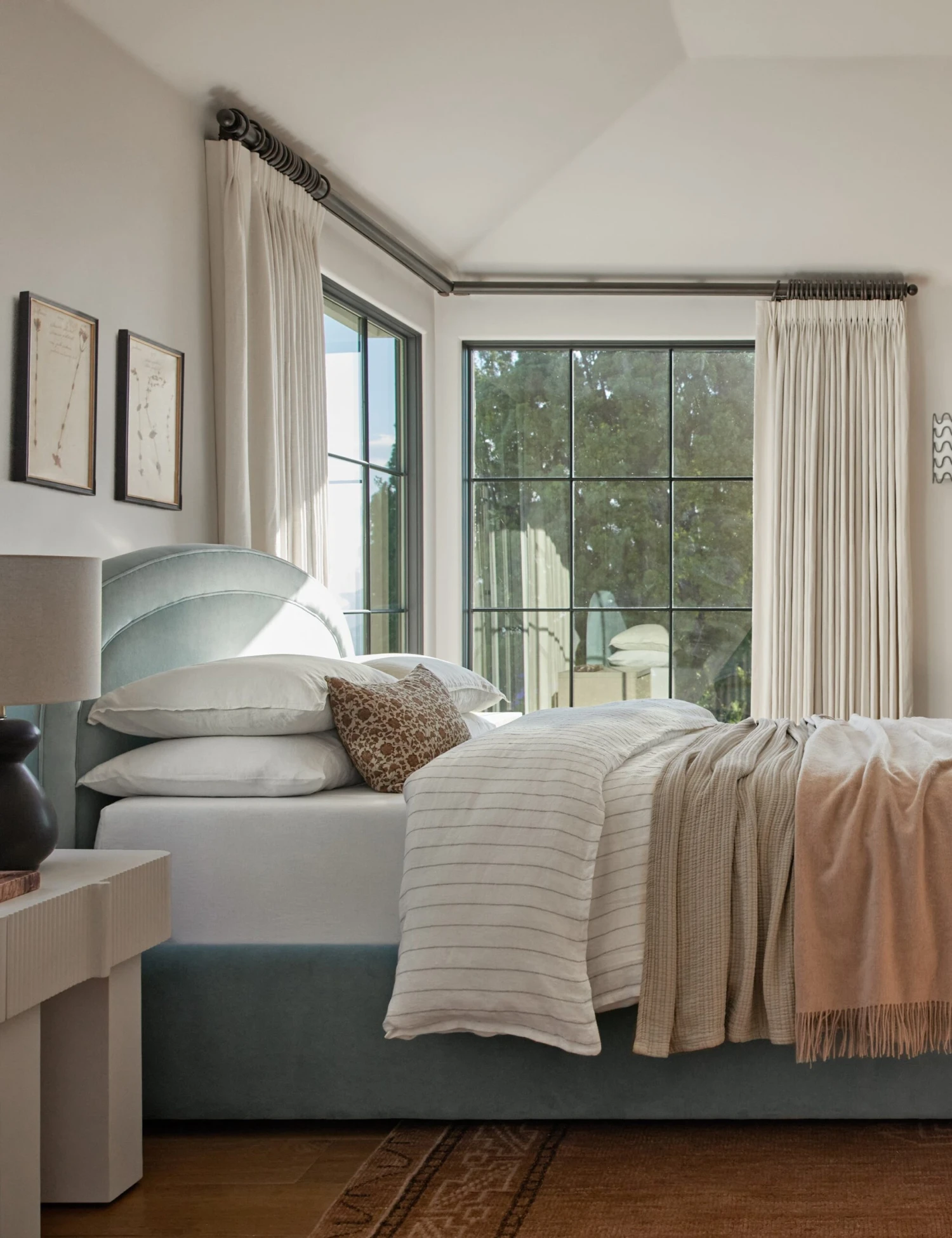 The Newbery bed offers a transitional look that’s set for timeless comfort. Its arched headboard styles a soft, stately silhouette highlighted by a welted border. With bespoke upholstery covering the bed frame and headboard, you can tailor the perfect centerpiece for your curation.