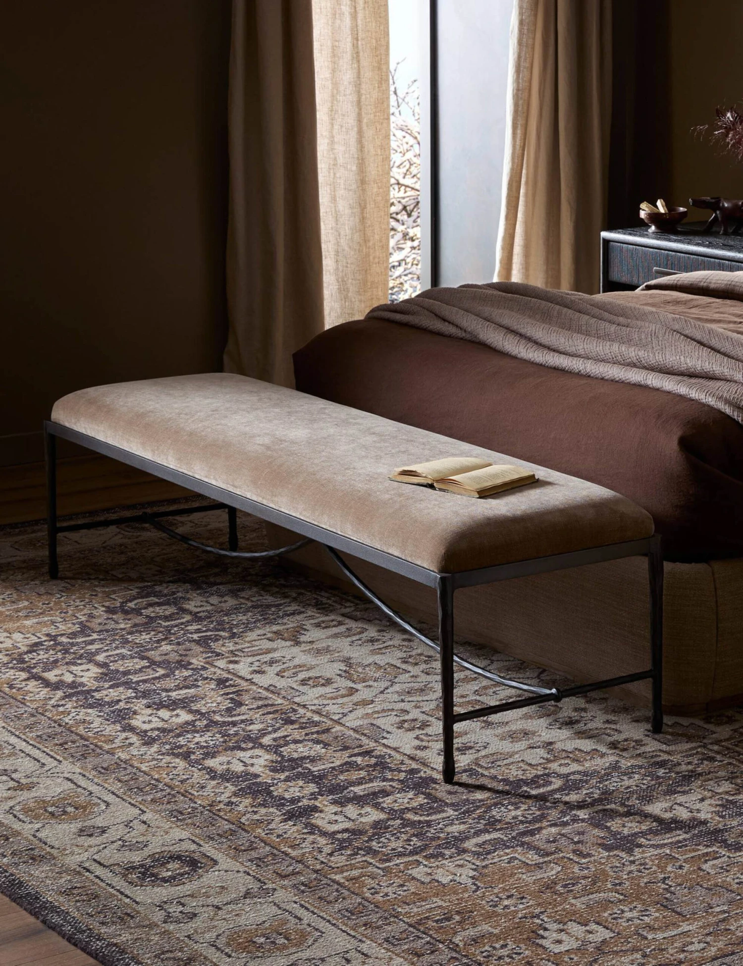 Perlaza blends transitional ease with Art Deco style in a sleek, streamlined silhouette. This bench pairs plush velvet upholstery with a hammered iron base featuring curved stretchers that bring a graceful bearing to the design. Whether placed at the foot of a bed, in an entryway, or styled beneath a window, it offers an elevating touch with a timeless feel.