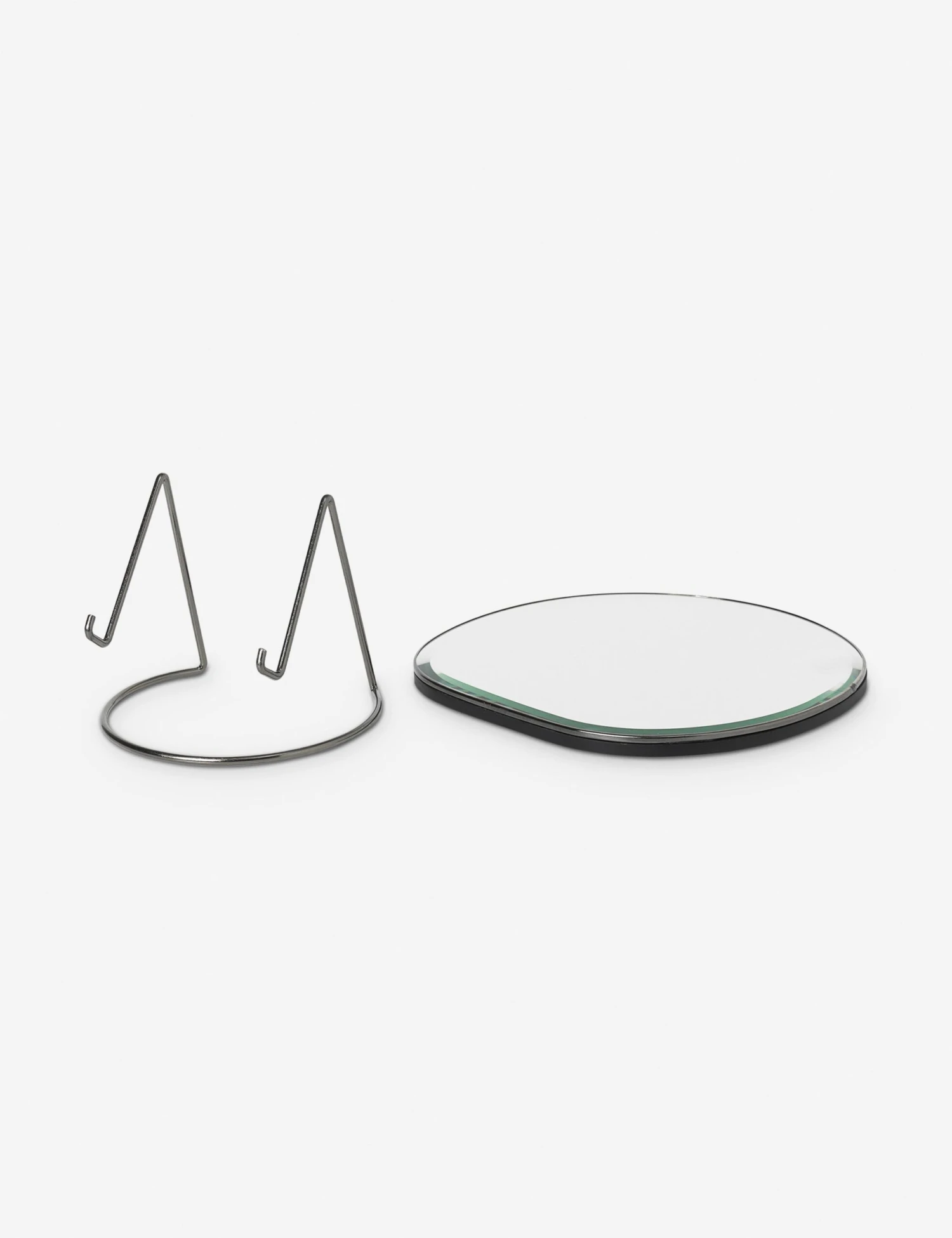 The Pond mirror’s organic silhouette is encased in a slim metal frame and stand, offering a hint of dimension and contrast in any setting. This striking tableteop mirror is a stunning piece that adds artistry to any tabletop. Perfect for a dresser or for quick look-checks at your home workspace.