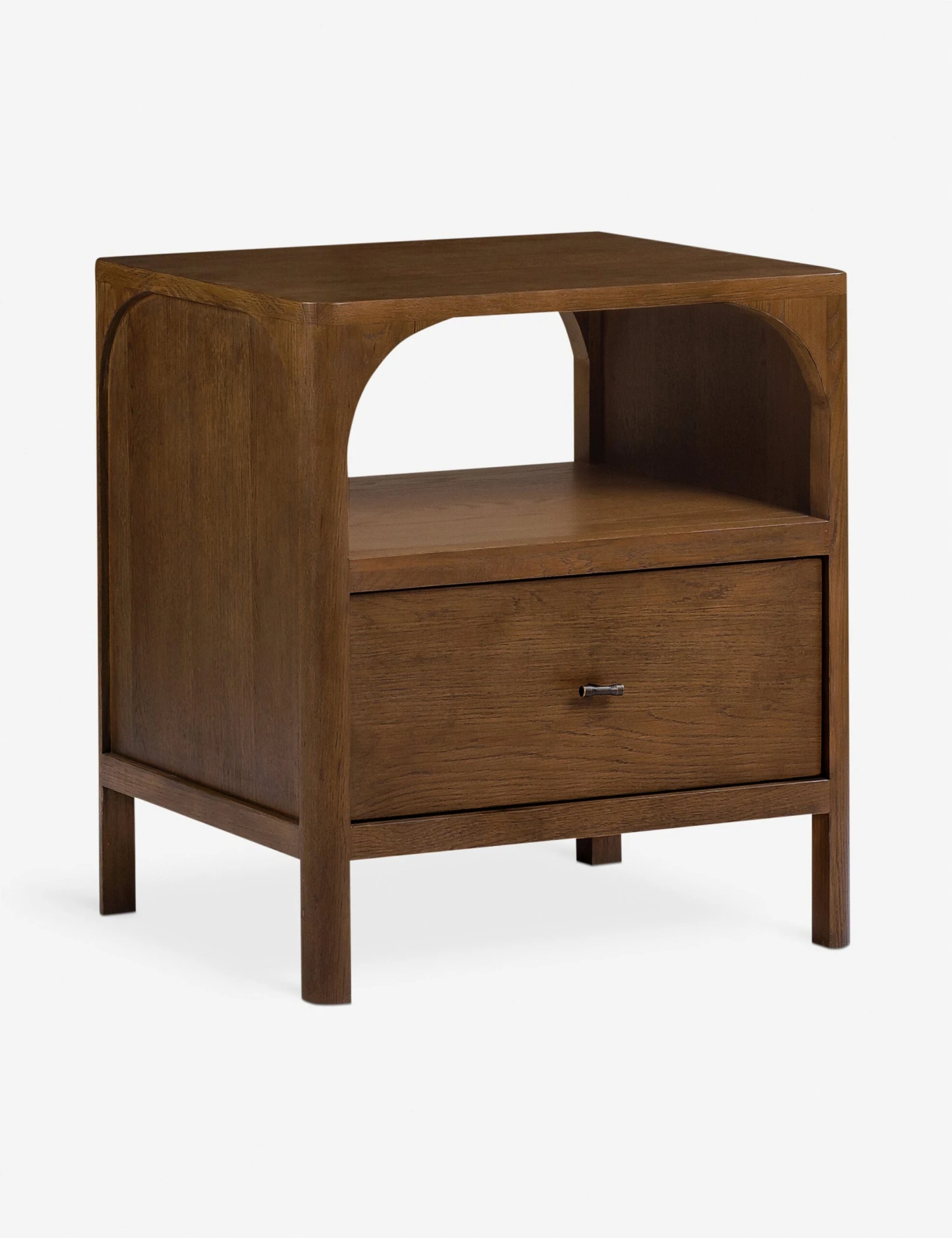 Clean lines and natural oak grain lend a simple elegance to this modern nightstand. The wood nightstand is hand-finished with a walnut stain, bringing a rich tone to your bedside. A soft-close drawer completes the design for a seamless touch of bedside storage.
