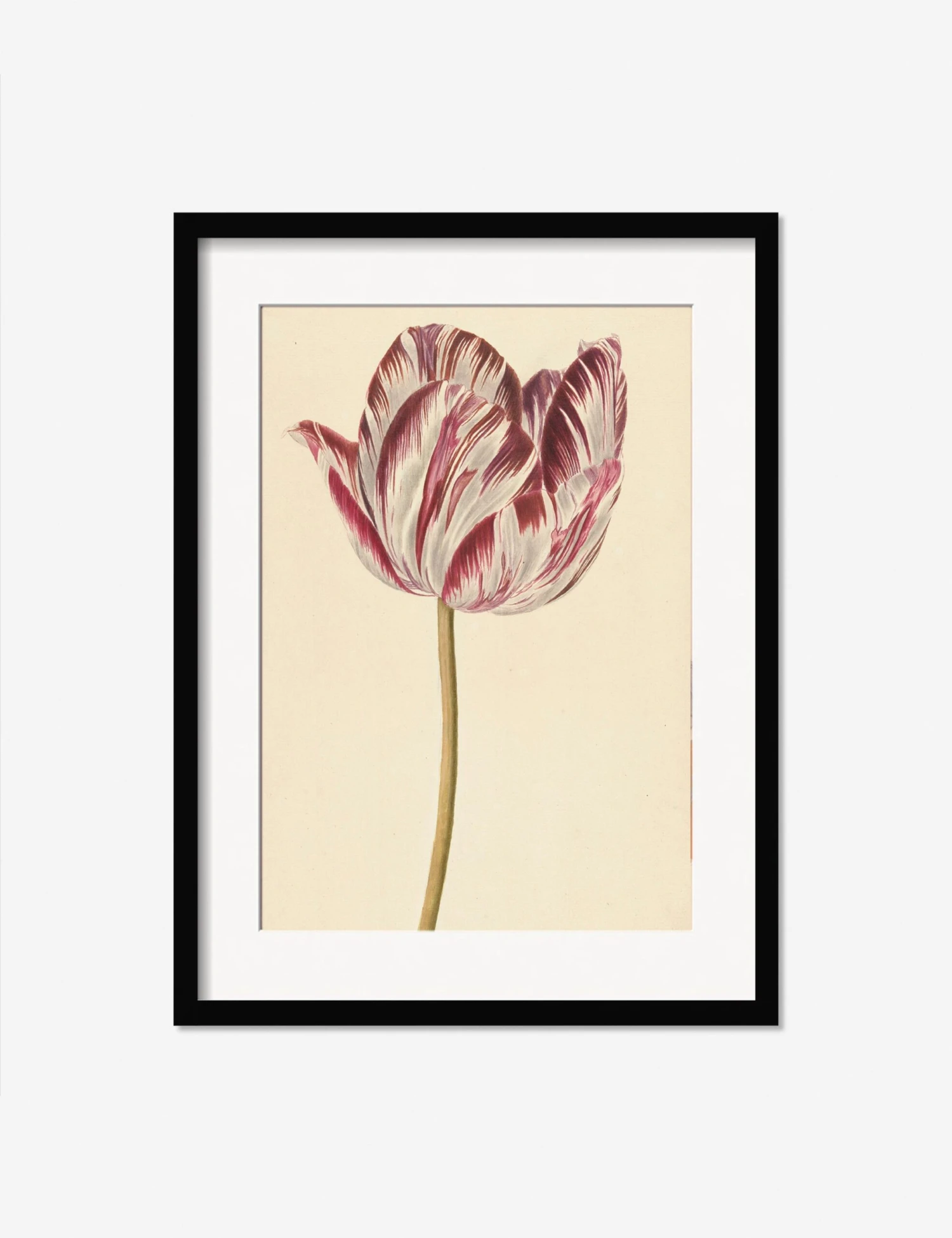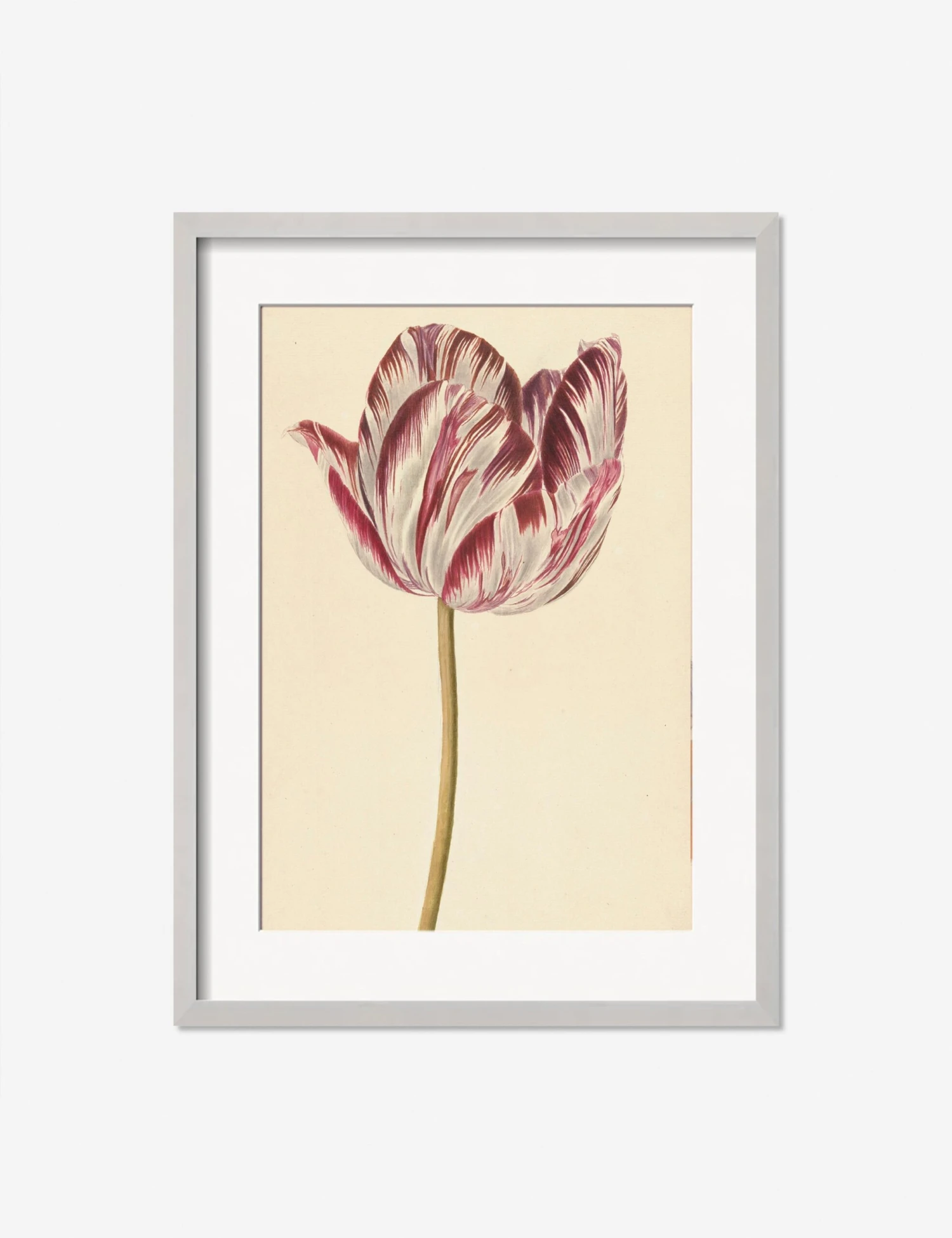 This wall art print features a tulip in bloom against a neutral backdrop offering a delicate study in texture and form. The shading on the stem and wispy lines of color on each petal offers a striking elegance for transitional wall decor.