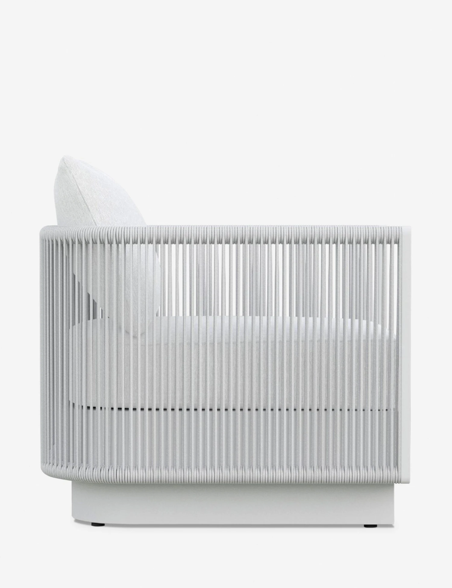 The Romero accent chair cuts a clean, modern silhouette in white. The aluminum frame features all-weather rope accents adding texture and accentuating the blend of precise angles and rounded lines. With its performance cushions, this chair is set for effortless elegance in a refined patio or sunroom edit.