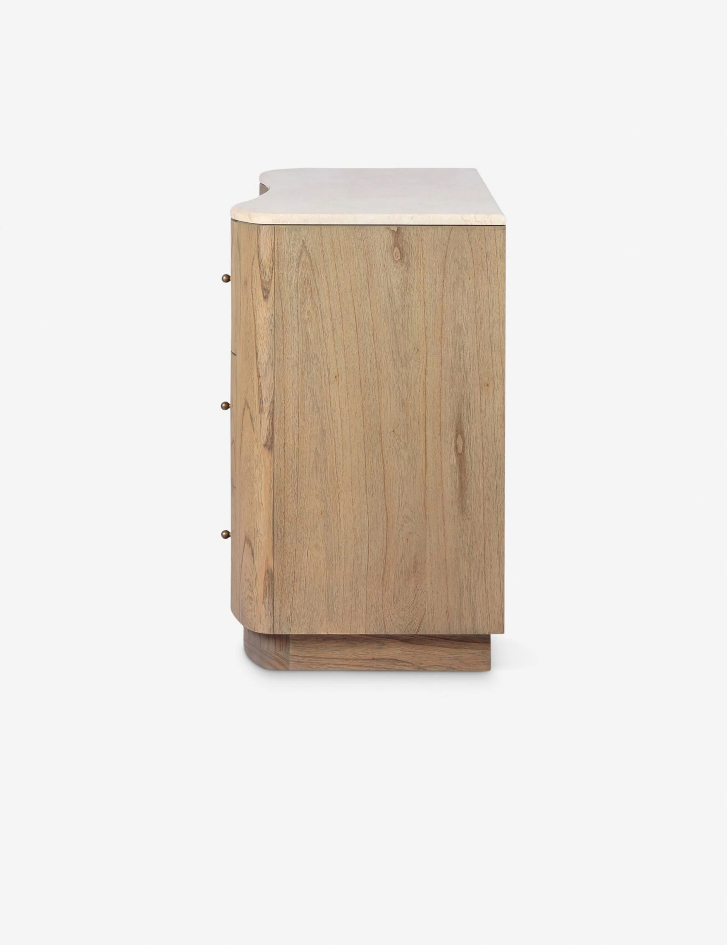 This wide dresser brings sculptural shape and organic texture to the bedroom. Crafted from warm-toned wood with a creamy marbled top, this piece offers generous storage in a soft, rounded silhouette. We love this dresser for grounding a modern space with refined storage.