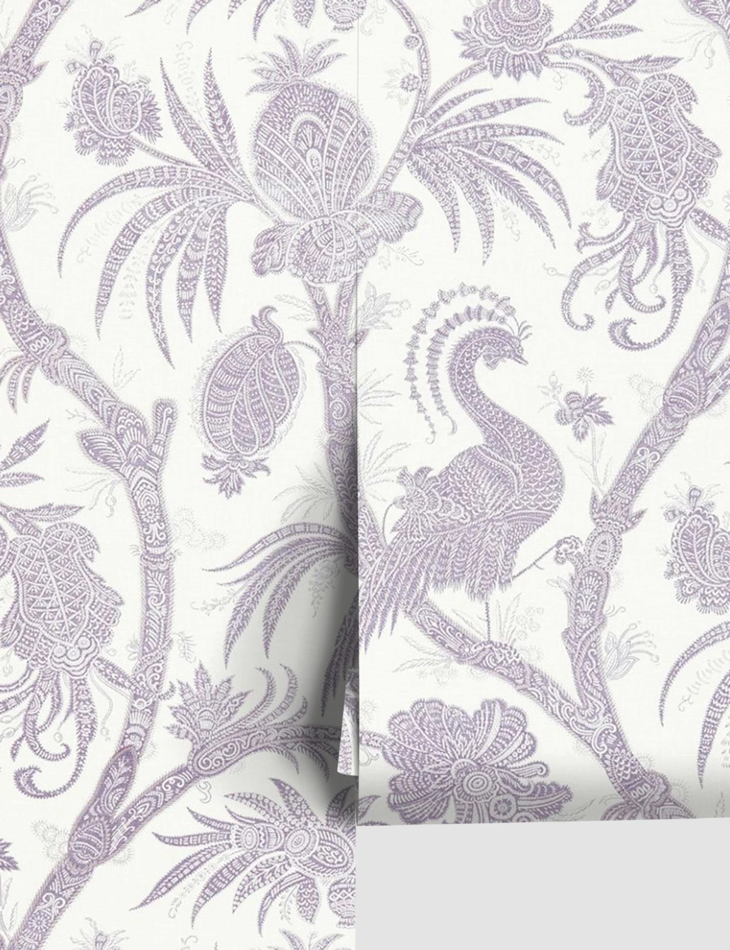 Intricate wallpaper patterns make any space feel more luxurious. Bringing a cultural, artistic look to bare walls, this decorative wallpaper’s two-tone palette features peacocks, flowers, and palms with detailed linework throughout.