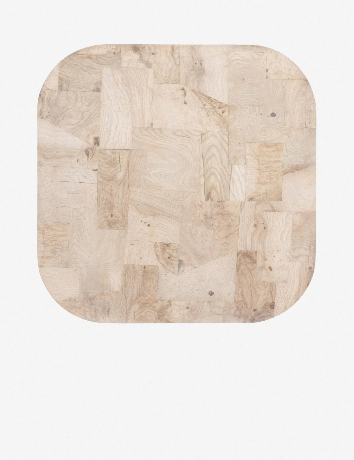 Freshen up the look of your living room with the patchwork tabletop design, rounded corners, and lighter walnut finish of this wood coffee table. Crafted from bleached ash burl, it features mahogany veneer sides and is finished with a sleek inset base. Pair this coffee table with desert hues or tailored neutrals.