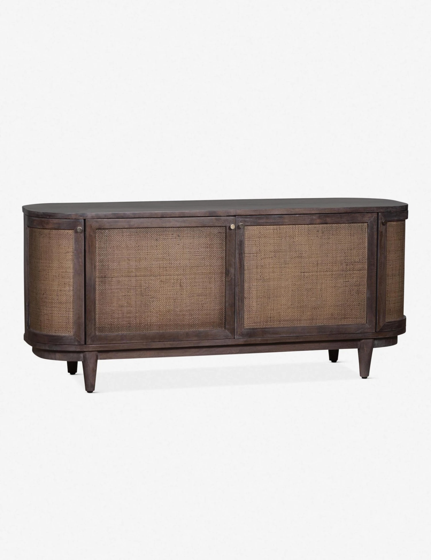 A transitional storage piece with plenty of character. Finished with curved ends and caned door fronts, this wooden media console has a stately look that doesn’t overpower your space.